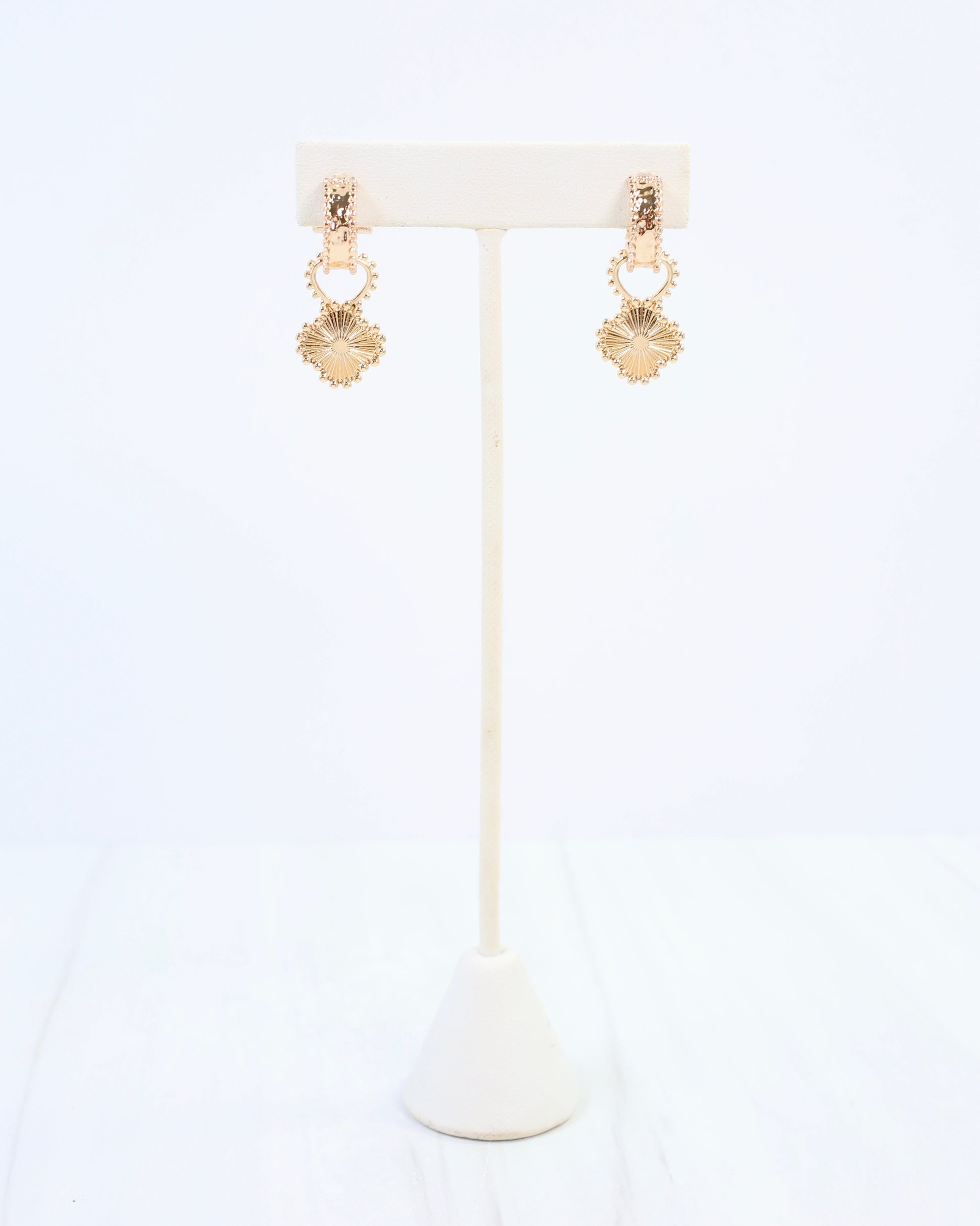 The Hector Clover Hoop Earring in Gold features a stylish gold hoop with a charming dangling clover. The clover showcases a ribbed texture and a dotted design around its outer edge, adding a unique and fashionable touch to your accessory collection. Perfect for enhancing your everyday or special occasion outfits with subtle elegance.