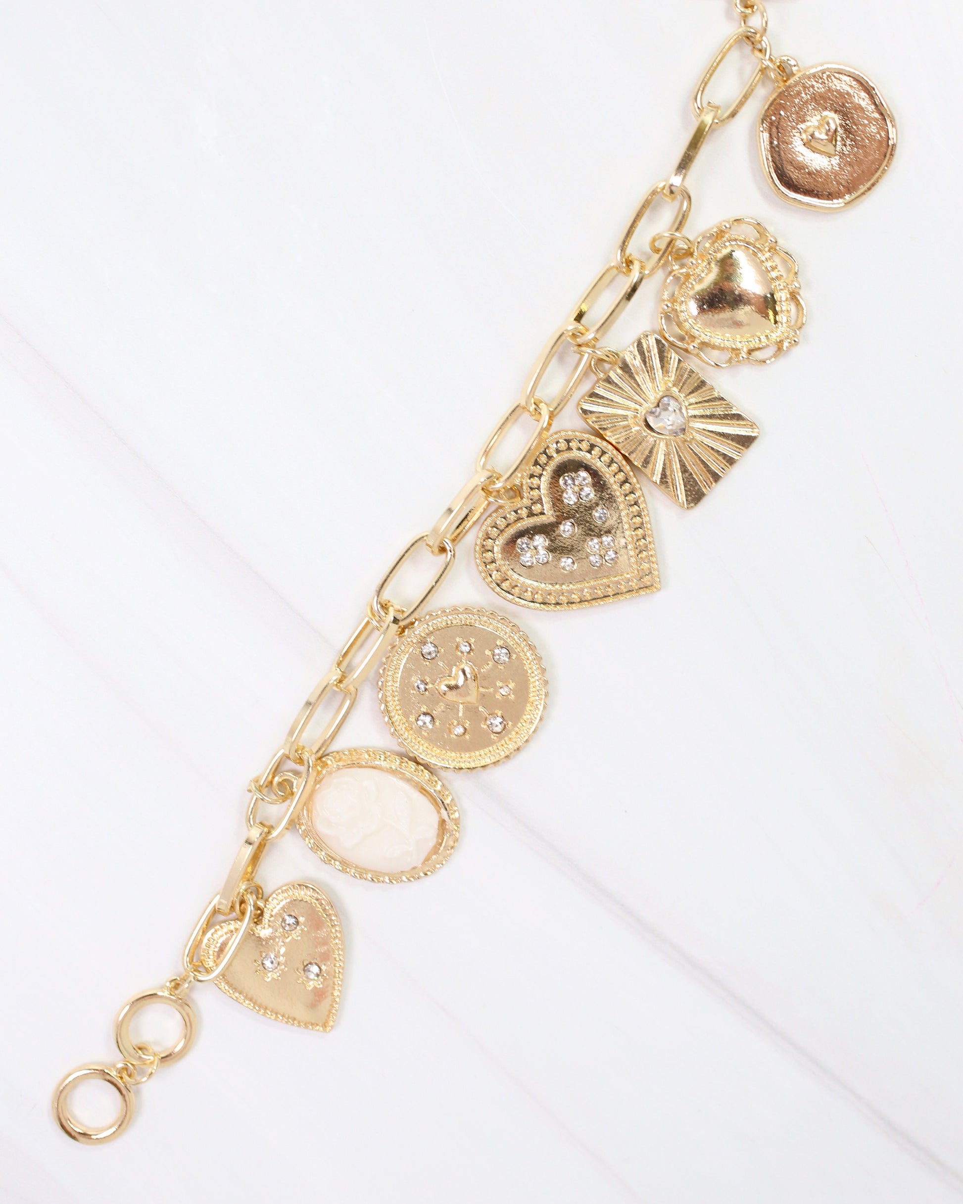 Elevate your accessory game with the Henley Heart Charm Bracelet in Gold. Featuring a stylish link design adorned with multiple heart, coin, and cameo charms, this bracelet offers a chic, layered look. Its toggle closure ensures a secure and easy fit, making it the perfect statement piece to complement any outfit with fashionable flair.