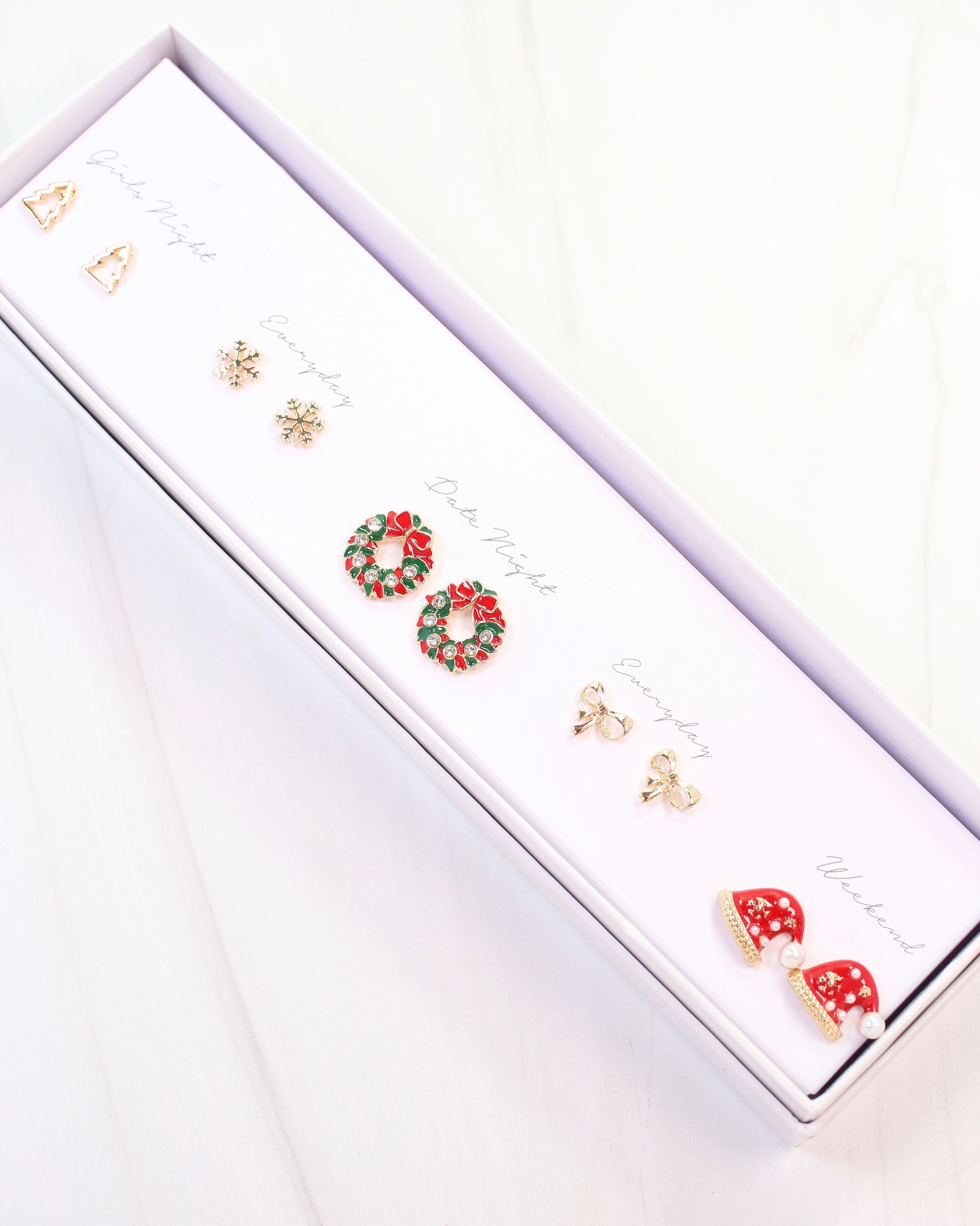 Celebrate the season with the Holiday Cheer Earring Set in Red. This stylish set includes five festive studs featuring gold cutout trees, snowflakes, and bows paired with vibrant enamel wreaths and Santa hats. Perfect for adding a polished, seasonal touch to any outfit.