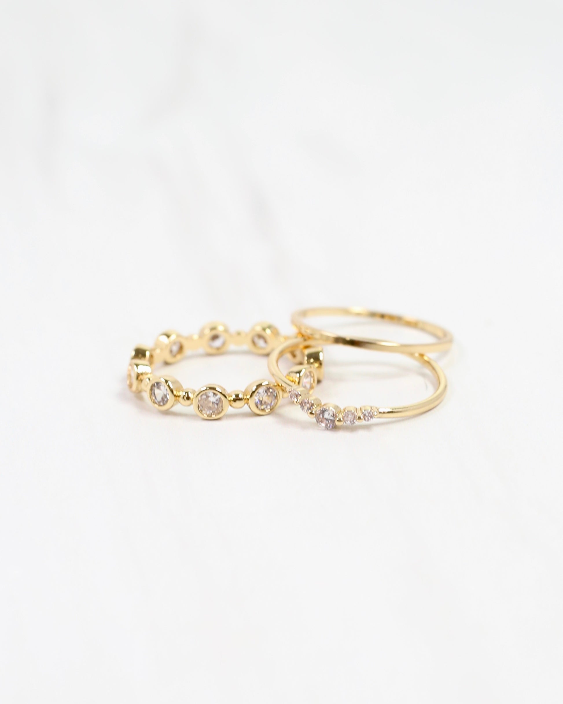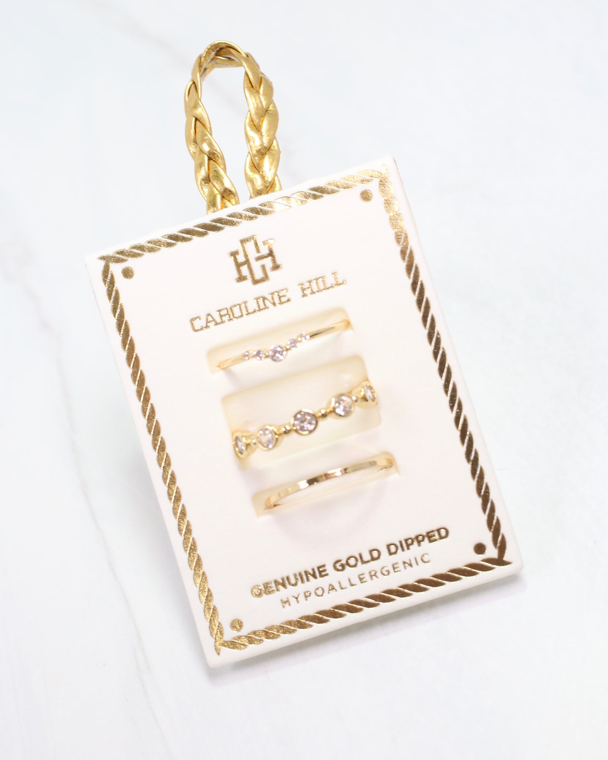 Sparkle up your style with the Izzy Ring Set Gold! This playful trio includes a circle stone band, a thin band adorned with a cz cluster, and a sleek thin gold band. Perfect for stacking or wearing solo, these gold-dipped rings add a fun, shining touch to any look.