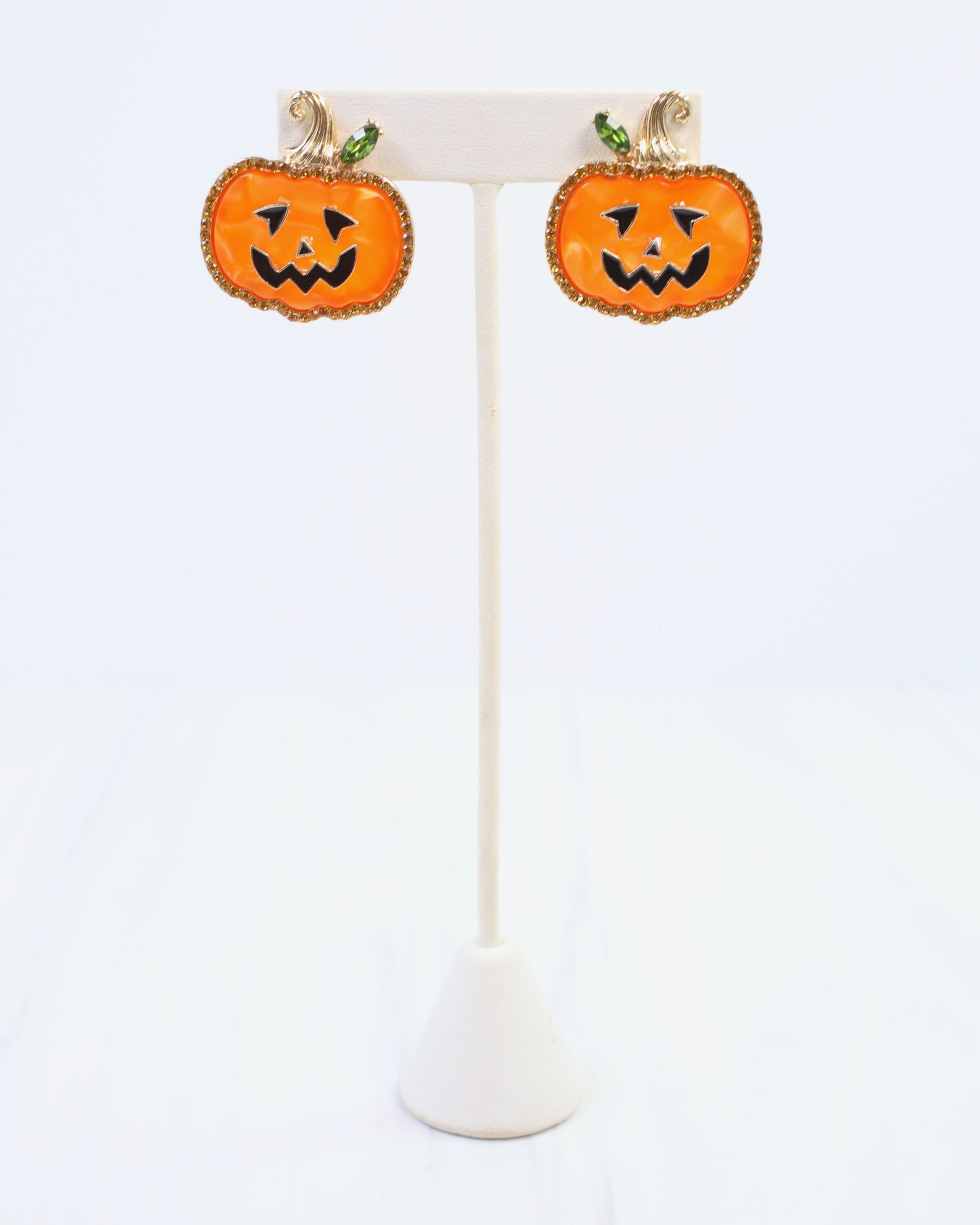 Add a playful, festive touch to your look with the Jillie Jack O Lantern Earrings in vibrant orange. These acrylic studs feature a bright jack o' lantern design, highlighted by a gold stem and a sparkling green crystal leaf. Trimmed with shimmering orange crystals, they bring a stylish pop of Halloween charm that's perfect for seasonal flair.