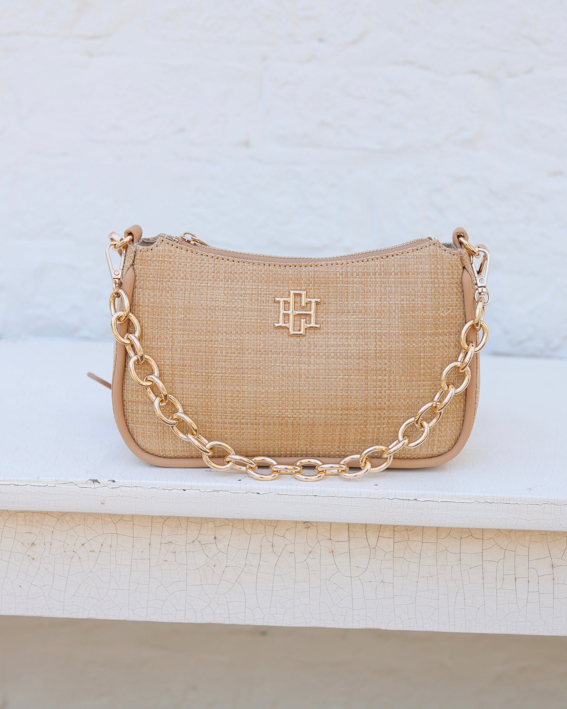 The Joan Crossbody in Natural. This fabulous straw crossbody is a wonderful size for travel and everyday wearing! It is made with a straw, vegan leather that is oh so soft. There is a removable chain accent that can also be used as a carrying strap as well. The crossbody strap is adjustable and removable as well. It features the Caroline Hill logo on one side and has a top zipper closure. The interior of the bag has a zippered pocket and two short open pockets as well.