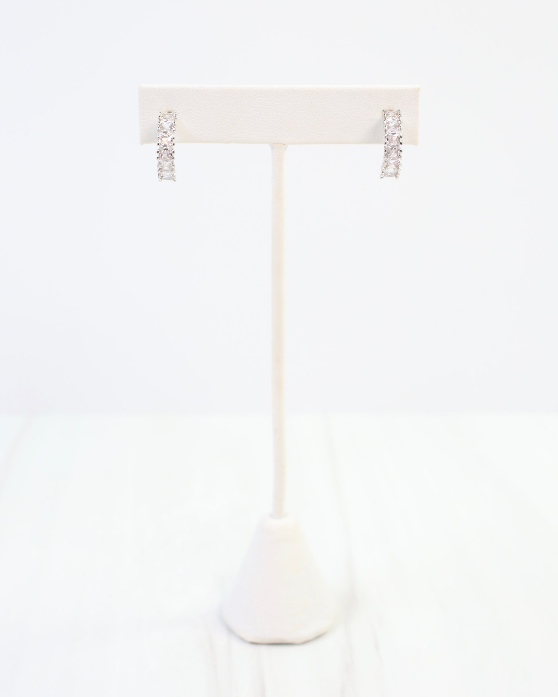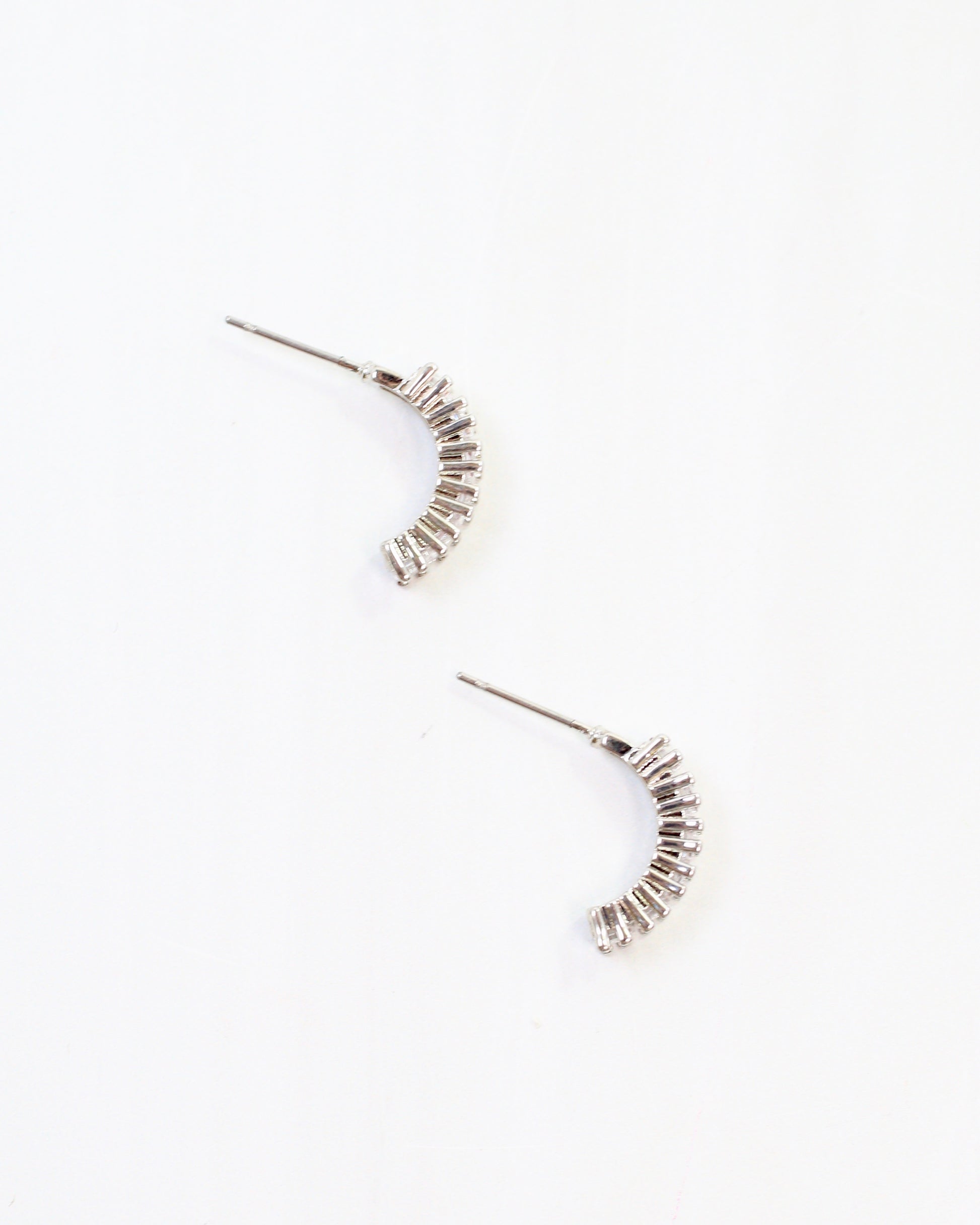 Elevate your style with the Jocelyn CZ Hoop Earring in silver. Featuring a chic half-circle design adorned with sparkling cubic zirconia stones, these earrings add a touch of glamour to any outfit. Perfect for both everyday wear and special occasions, they effortlessly highlight your fashion-forward edge.