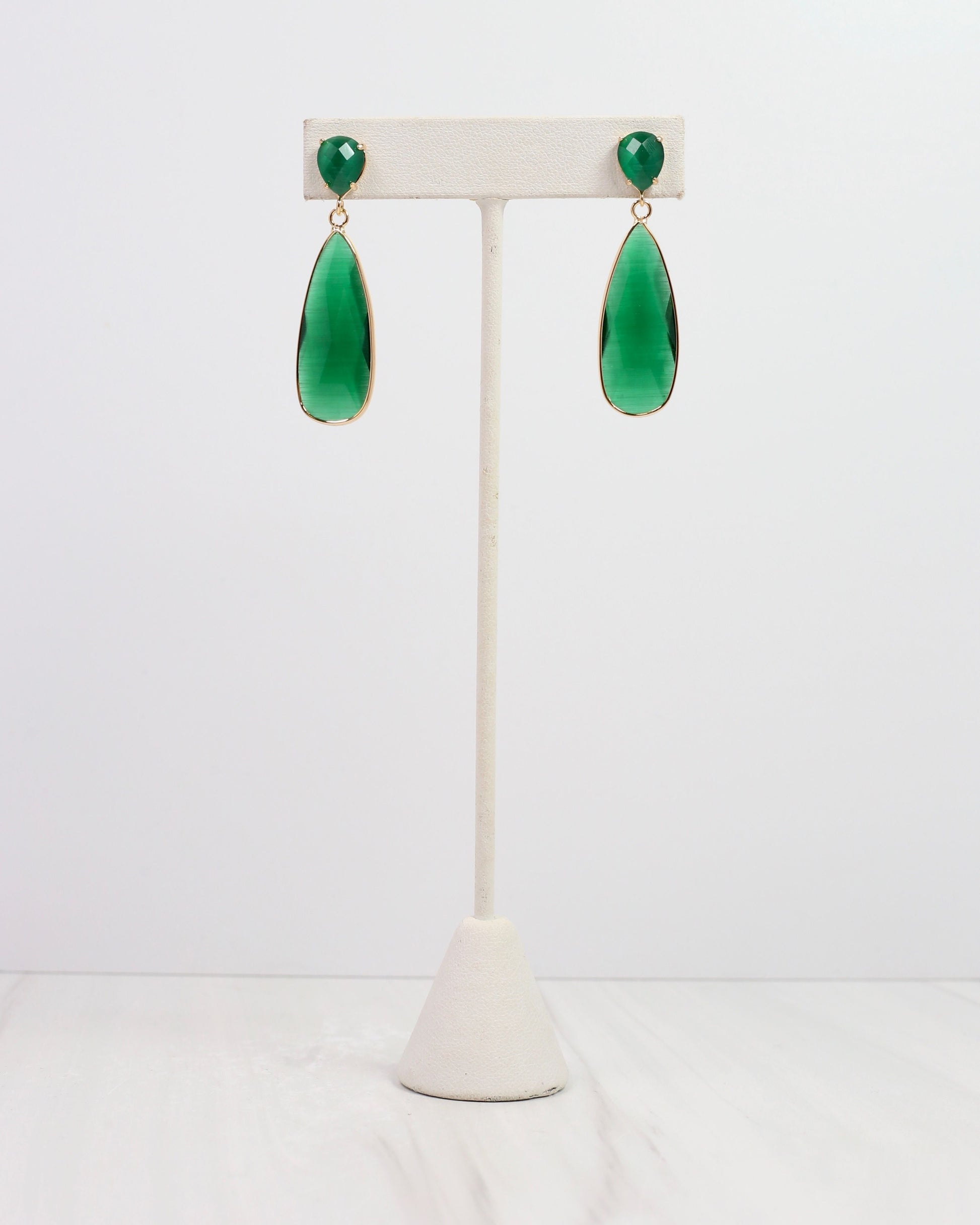 Add a splash of charm with the Jonsey Dangle Post Earring in Green. Featuring a faceted elongated teardrop that playfully swings from an inverted teardrop stone post, these earrings bring a fun yet elegant vibe to any outfit. Perfect for turning heads and brightening your day with a pop of color!