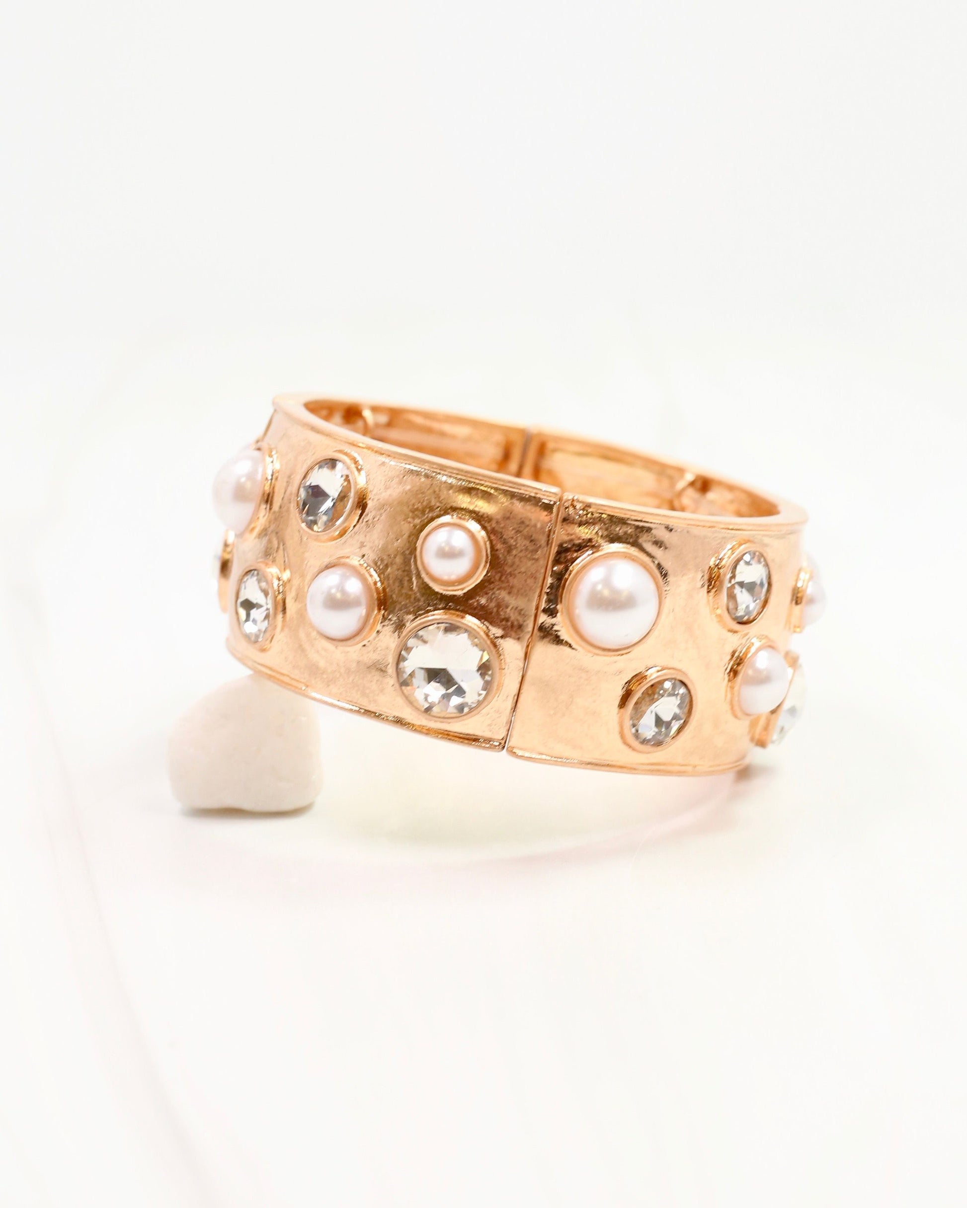 Add a touch of sparkle with the Julietta Stretch Bracelet in Pearl. This wide gold bracelet features a playful mix of round pearls, and clear crystals, creating an elegant yet fun accessory. Perfect for dressing up any outfit with a hint of glamour and charm.