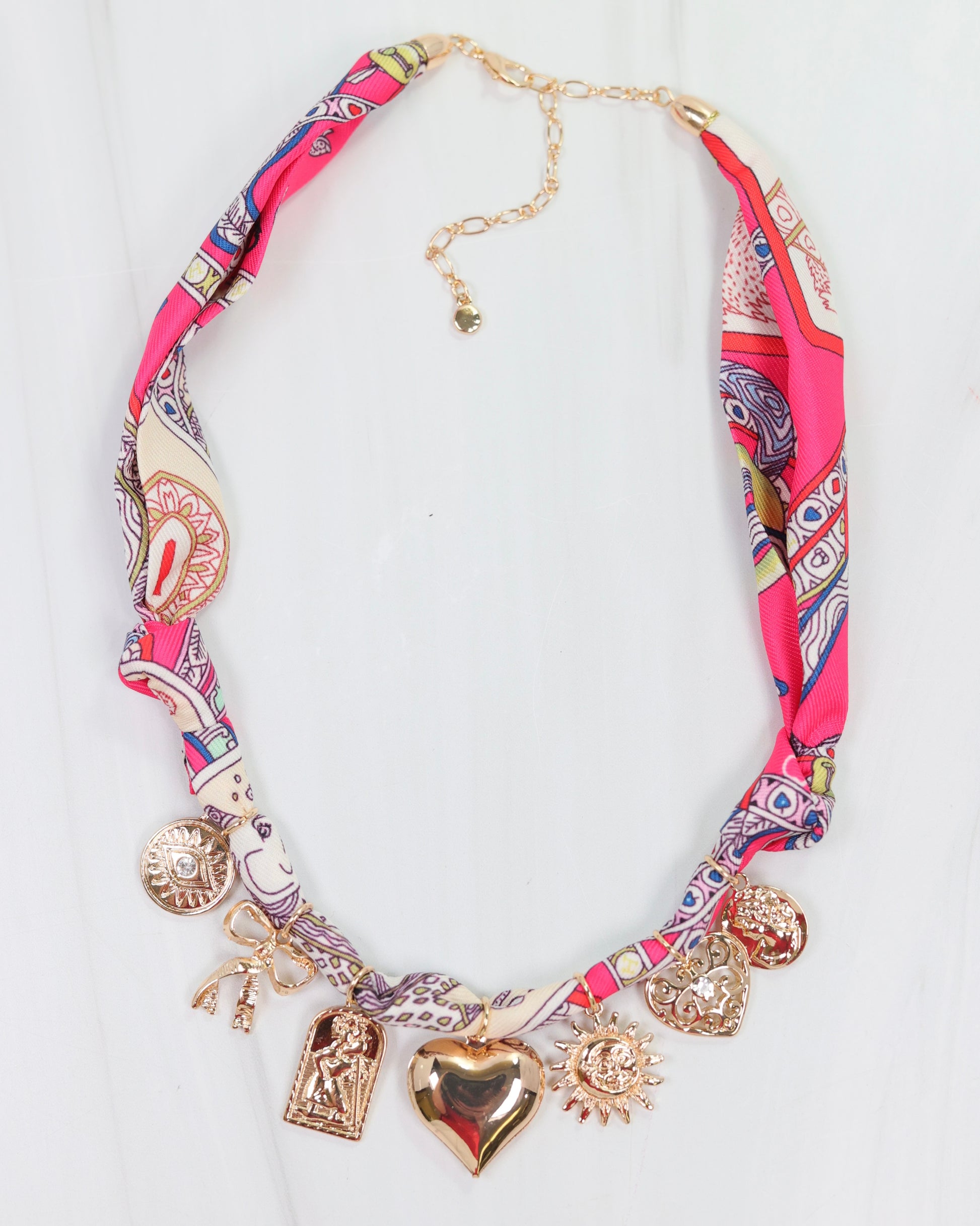 Add a pop of playful charm to any outfit with the Kat Multi Charm Scarf Necklace in vibrant fuchsia. This beautifully patterned scarf dazzles with an array of unique charms that catch the eye and spark conversation. Lightweight and versatile, it effortlessly elevates your look while making a bold, stylish statement. A must-have accessory that turns heads wherever you go!
