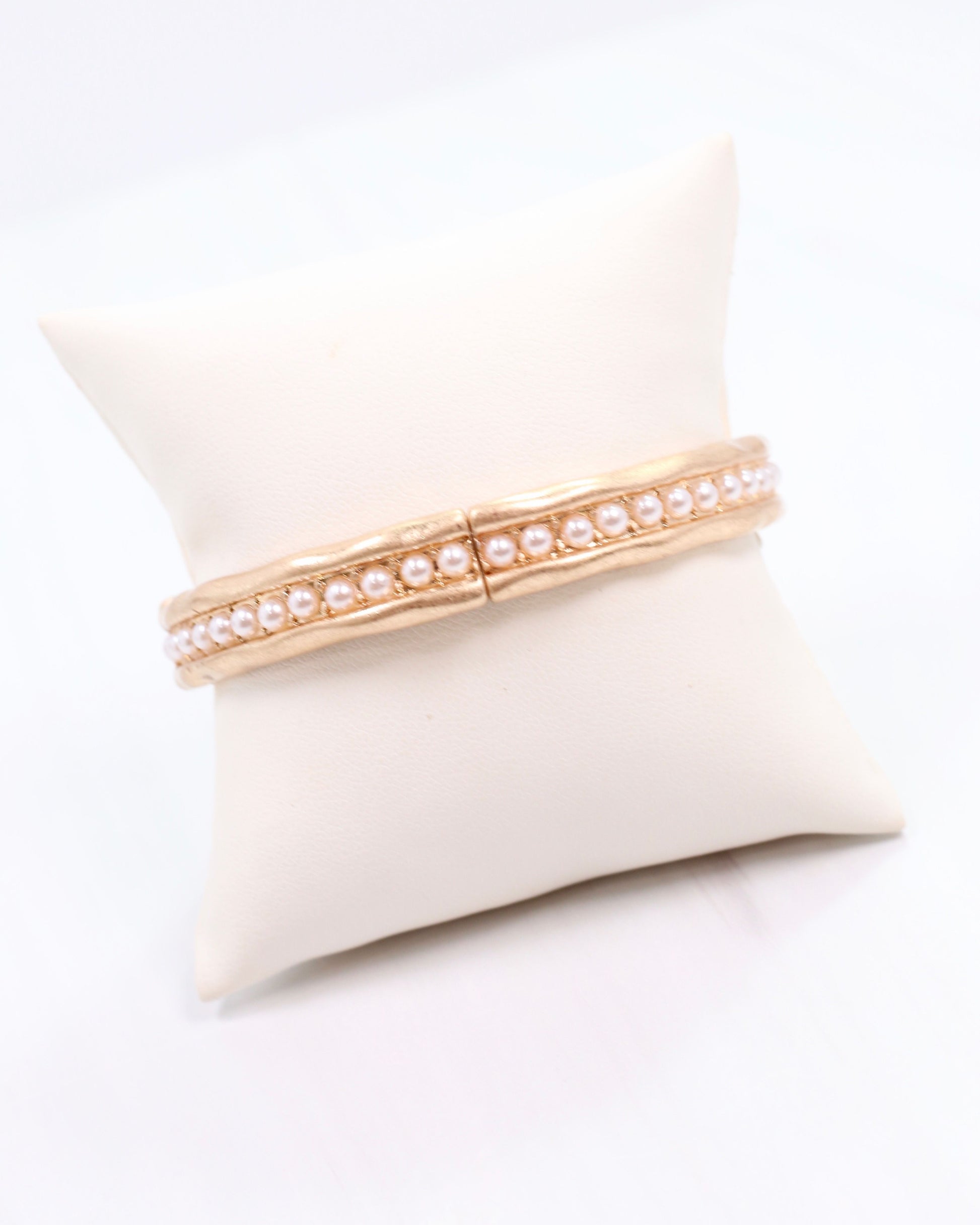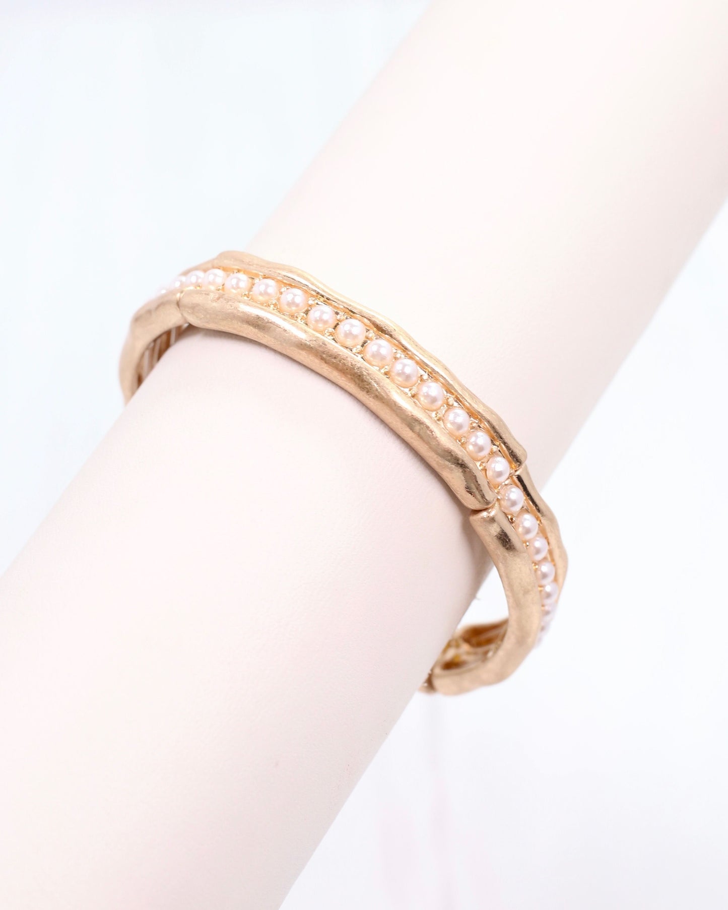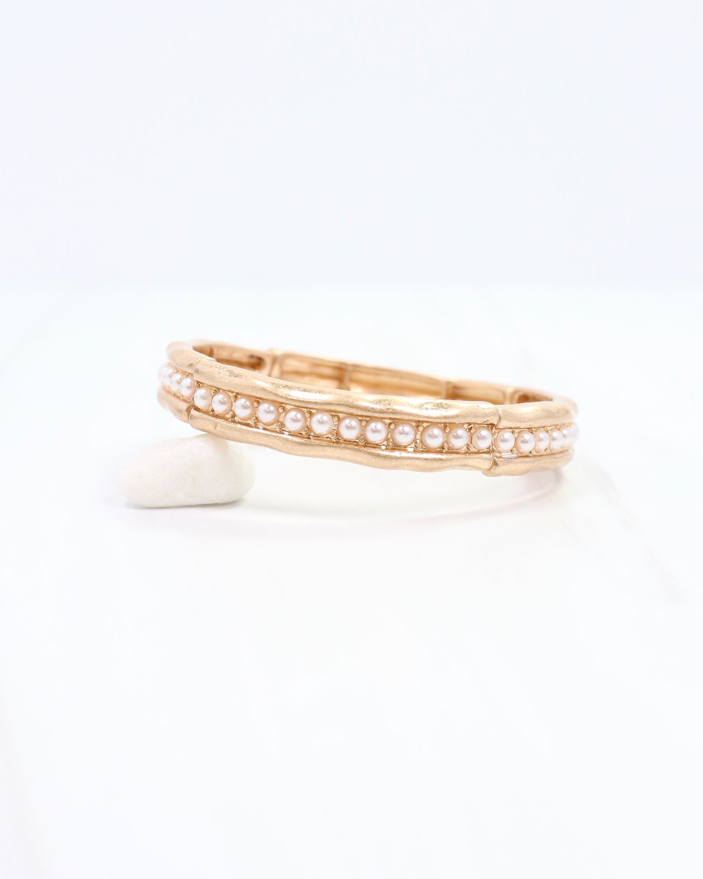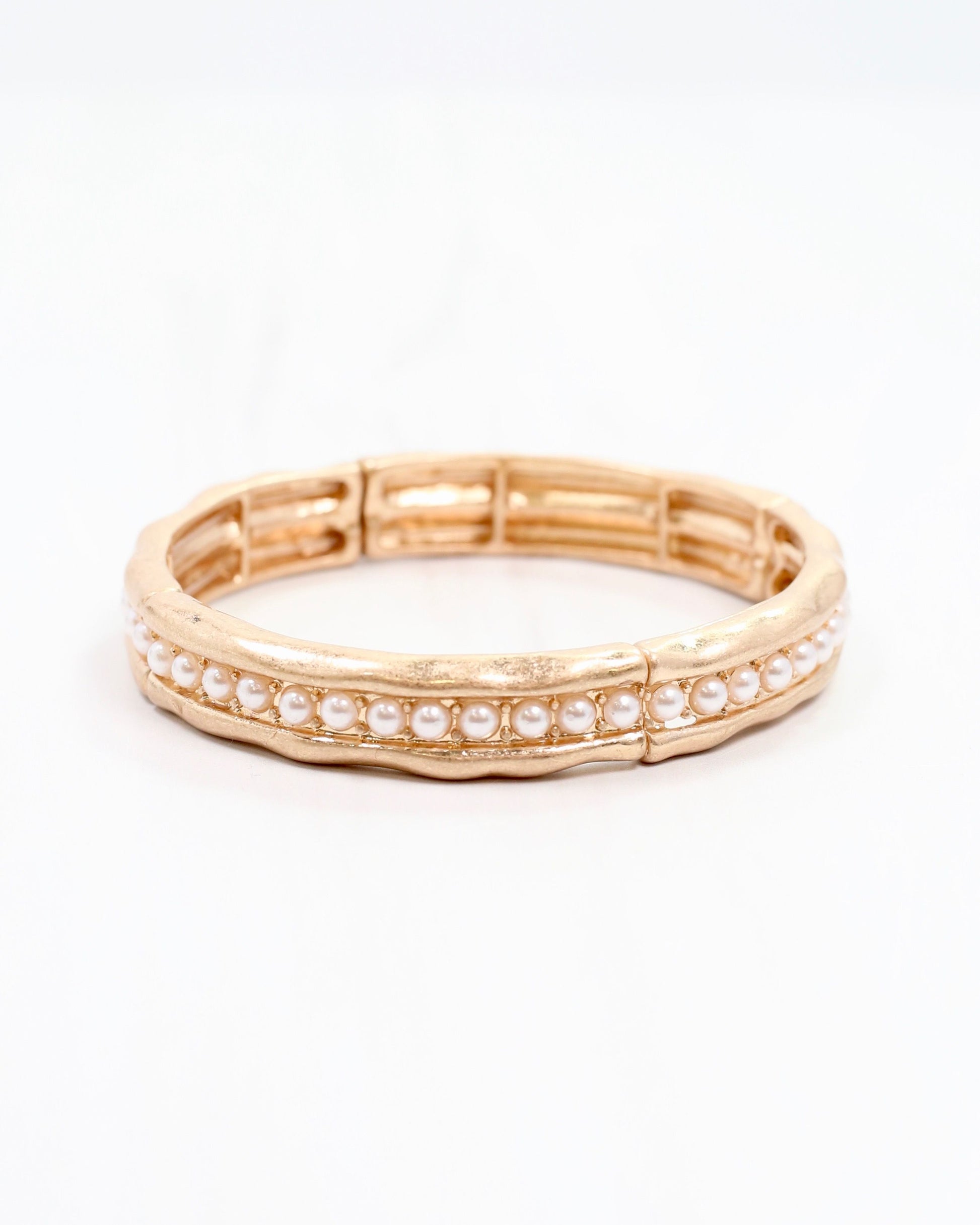 Add a touch of preppy elegance to your outfit with the Katarina Stretch Bracelet. The worn gold finish and delicate pearl detail create a classic look, while the stretch style ensures ultimate comfort. Perfect for stacking with other bangles, this bracelet is a must-have for any fashionista!