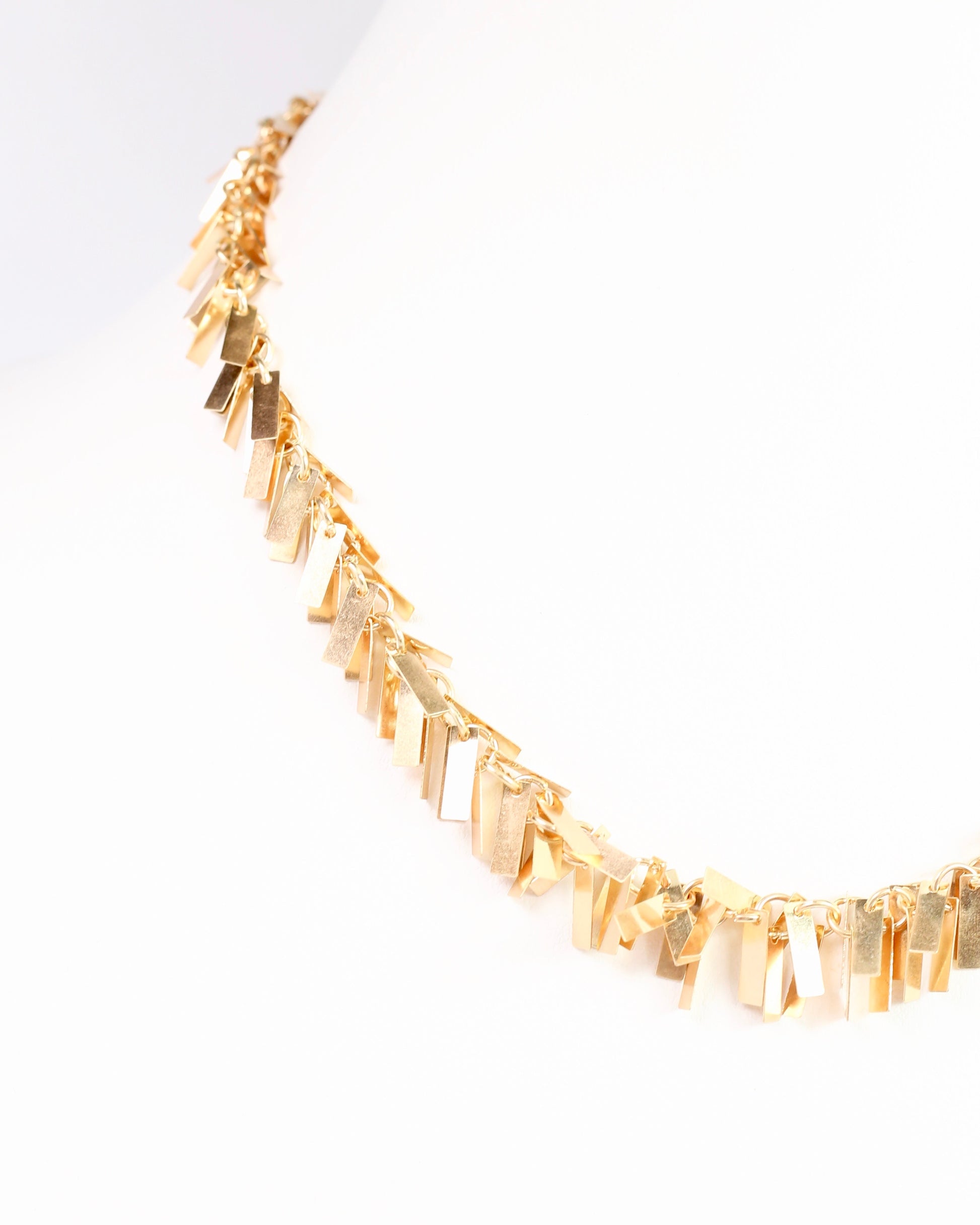 Elevate your style with the Kate Metal Fringe Necklace in Worn Gold. This striking piece features playful metal fringe that adds dynamic movement and a bold statement to any outfit. Perfect for dressing up your look, it effortlessly combines edgy charm with elegant sophistication.
