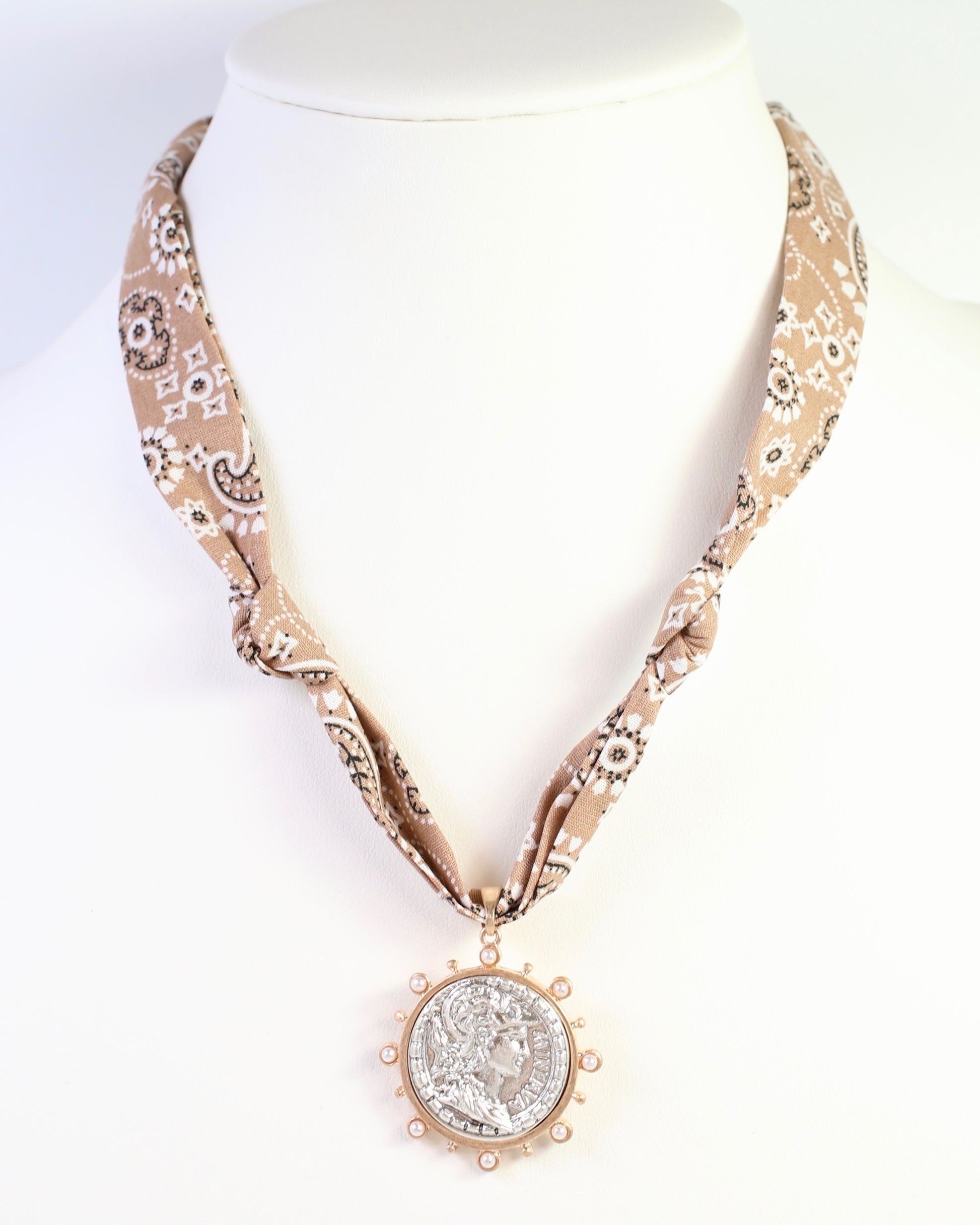 Add a playful touch to your outfit with the Keeley Scarf Charm Necklace in Khaki. This bandana-style scarf features double knots and a vintage-inspired two-tone charm with dotted edging, blending classic style with a fun, modern twist.