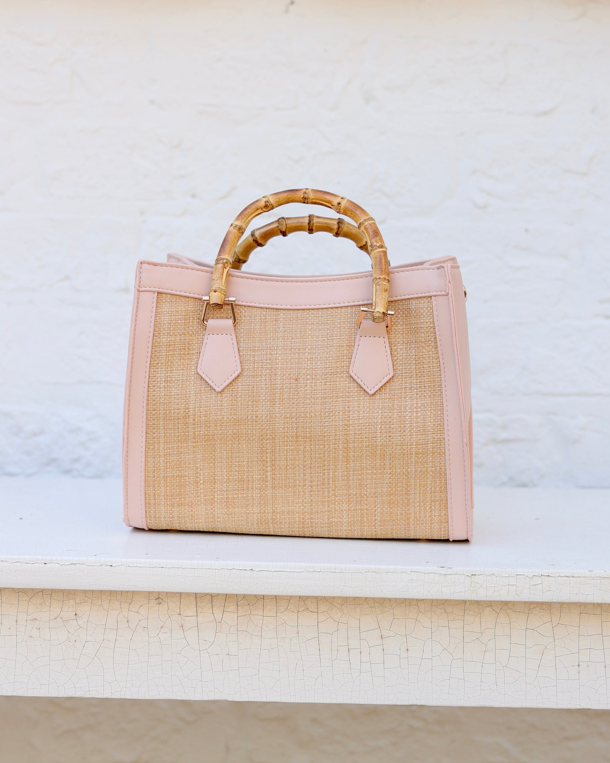 The Kennedy Tote in Natural Blush is this season's must-have style. Crafted with elegant bamboo handles and a removable crossbody strap, this mini tote transitions effortlessly from day to evening. Whether you're carrying essentials to the office or out for the weekend, its chic silhouette and versatile design make it the perfect companion for any occasion.