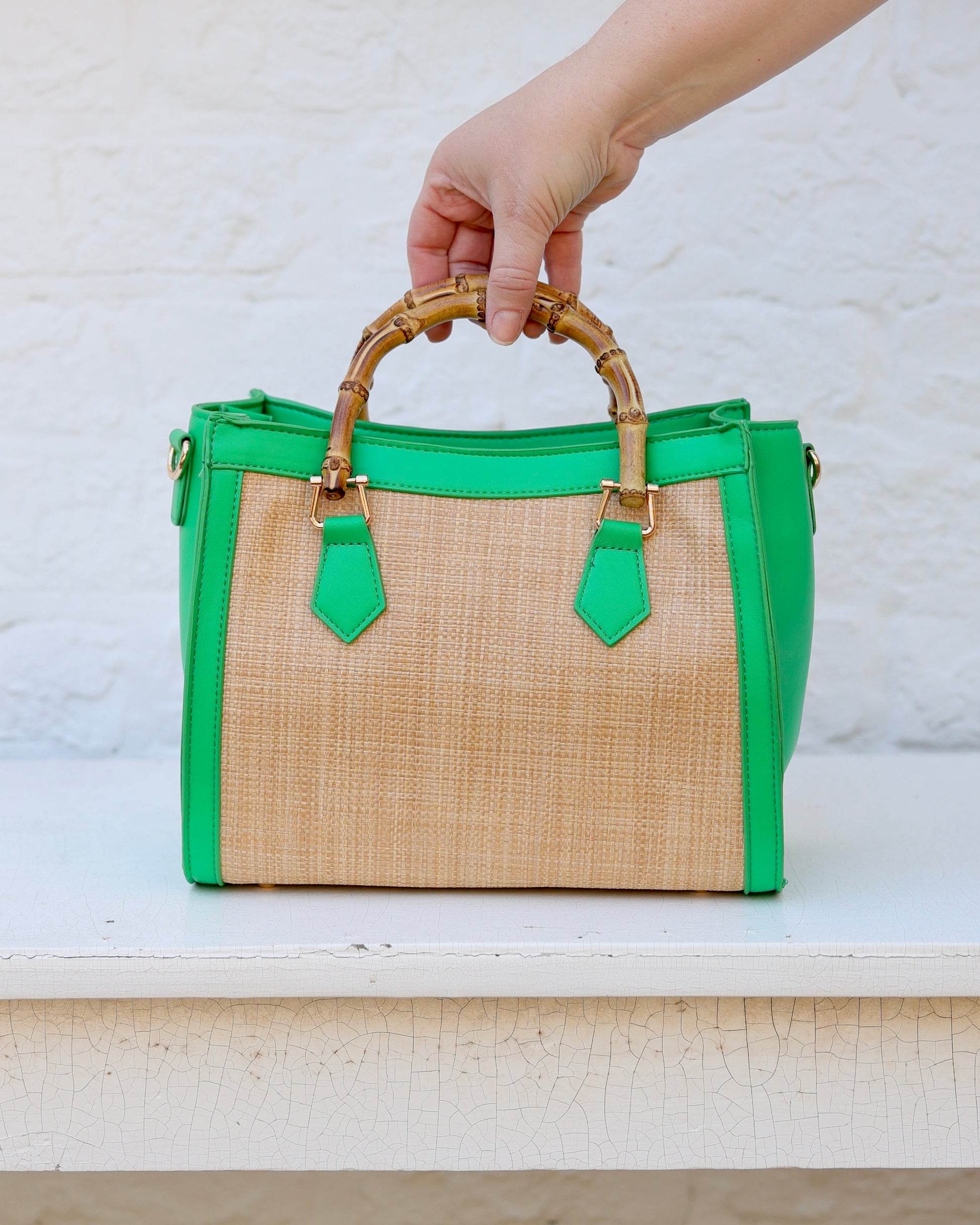 The Kennedy Tote in Natural Kelly Green is this season's must-have style. Crafted with elegant bamboo handles and a removable crossbody strap, this mini tote transitions effortlessly from day to evening. Whether you're carrying essentials to the office or out for the weekend, its chic silhouette and versatile design make it the perfect companion for any occasion.