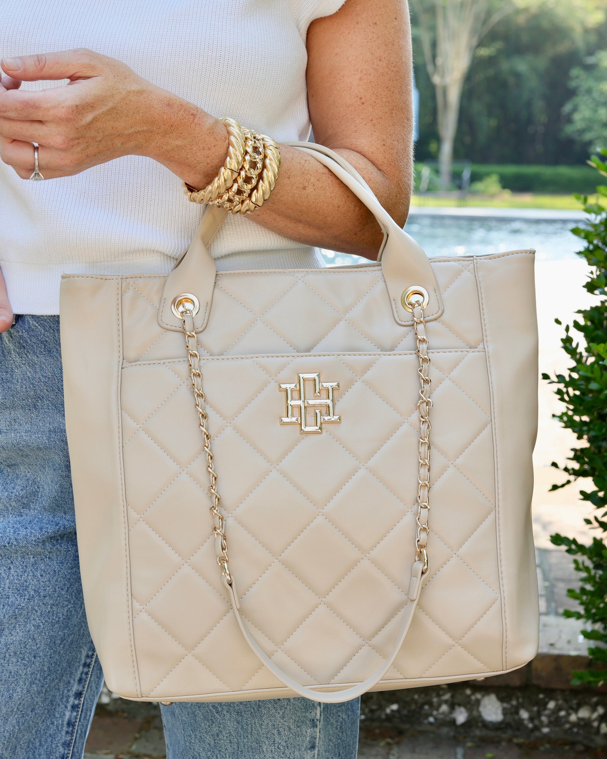 This tall magazine style tote is designed with a stunning vegan leather quilted fabric. It's a great, everyday bag that accommodates most laptops with plenty of space for daily essentials. It features a deep magnetic front pocket ideal for a large phone, along with versatile carrying options through short top handles and elongated braided handles. This tote includes a secure magnetic closure, along with two interior open pockets and one zippered pocket for efficient organization. There are feet on the bottom for added protection as well.