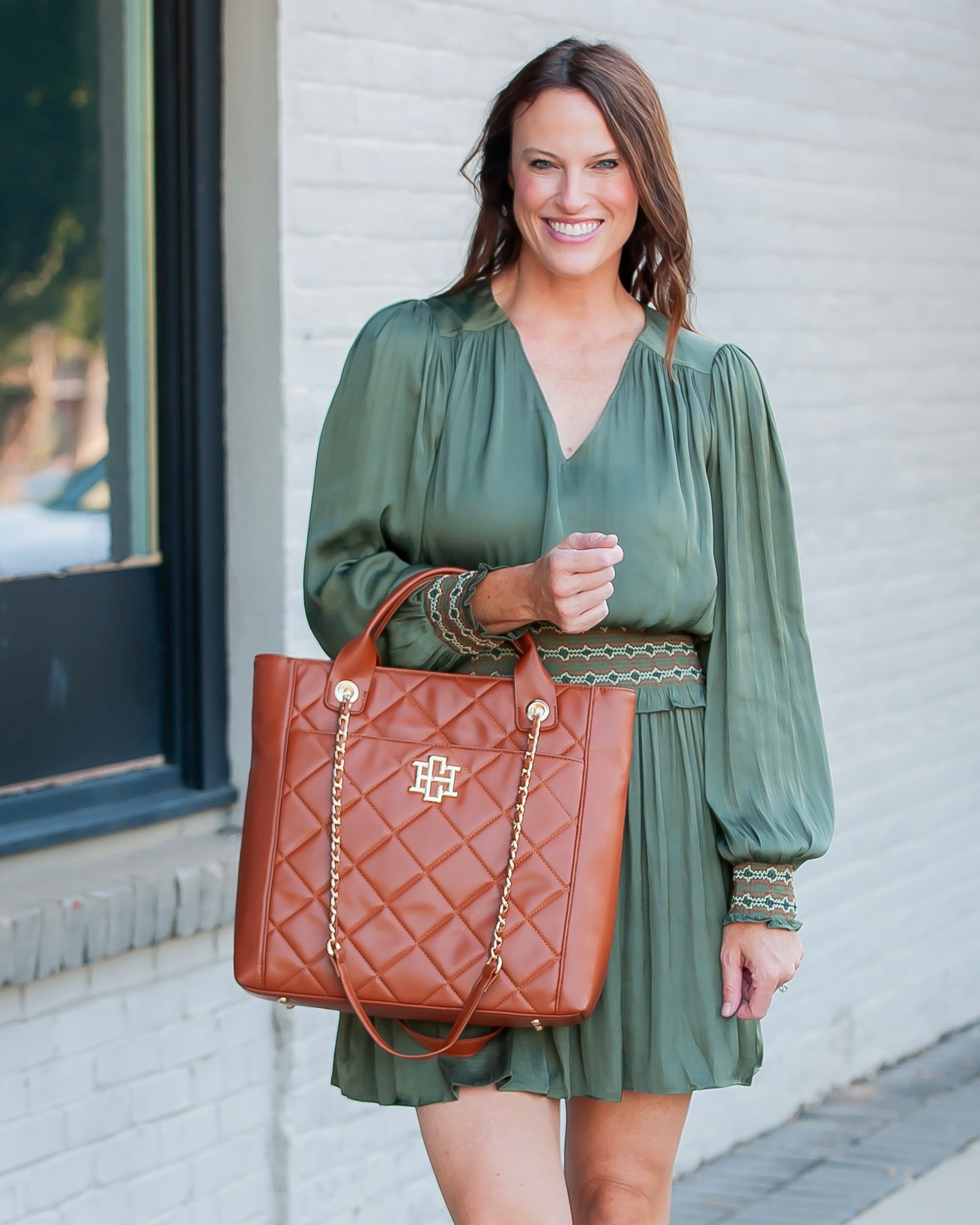 This tall magazine style tote is designed with a stunning vegan leather quilted fabric. It's a great, everyday bag that accommodates most laptops with plenty of space for daily essentials. It features a deep magnetic front pocket ideal for a large phone, along with versatile carrying options through short top handles and elongated braided handles. This tote includes a secure magnetic closure, along with two interior open pockets and one zippered pocket for efficient organization. There are feet on the bottom for added protection as well.