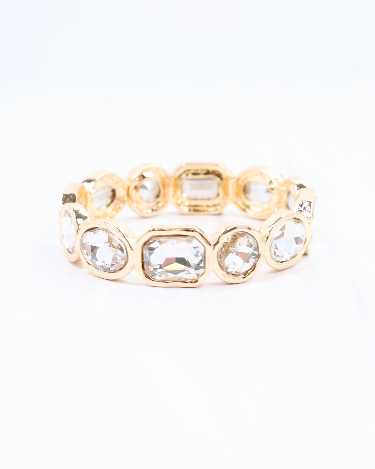 Add a touch of sparkle with the Lambert Stretch Bracelet in Clear. Featuring a playful mix of clear stones in various shapes, this gold-trimmed stretch bracelet effortlessly fits most wrists. Perfect for adding a dash of glam to any outfit!