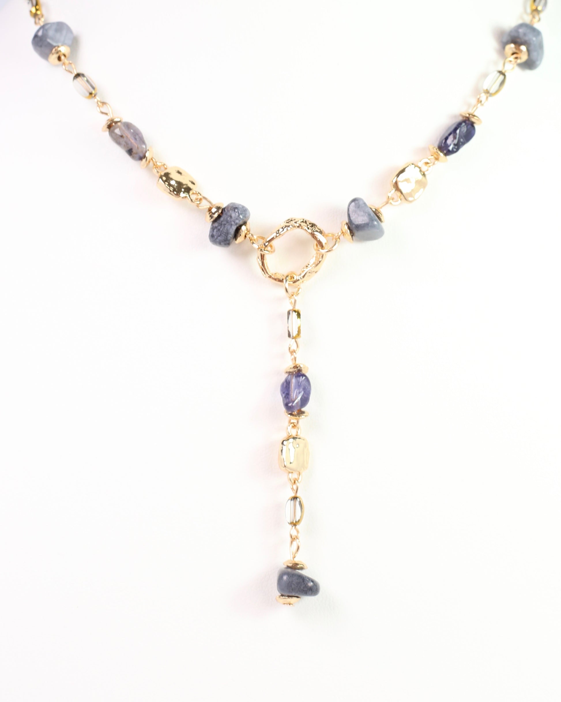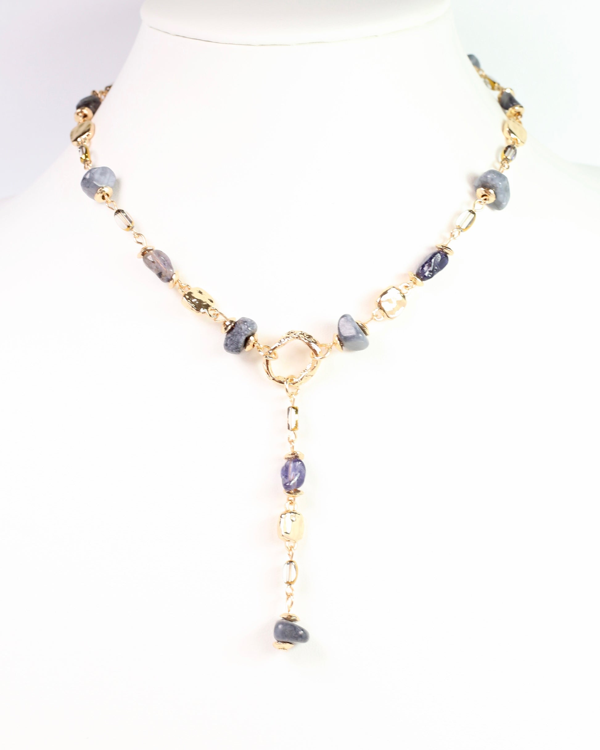 The Letti Stone Y Necklace in Gray features gold and multi-shaped gray natural stones, creating a unique layered look. Perfect for adding effortless style to any outfit.