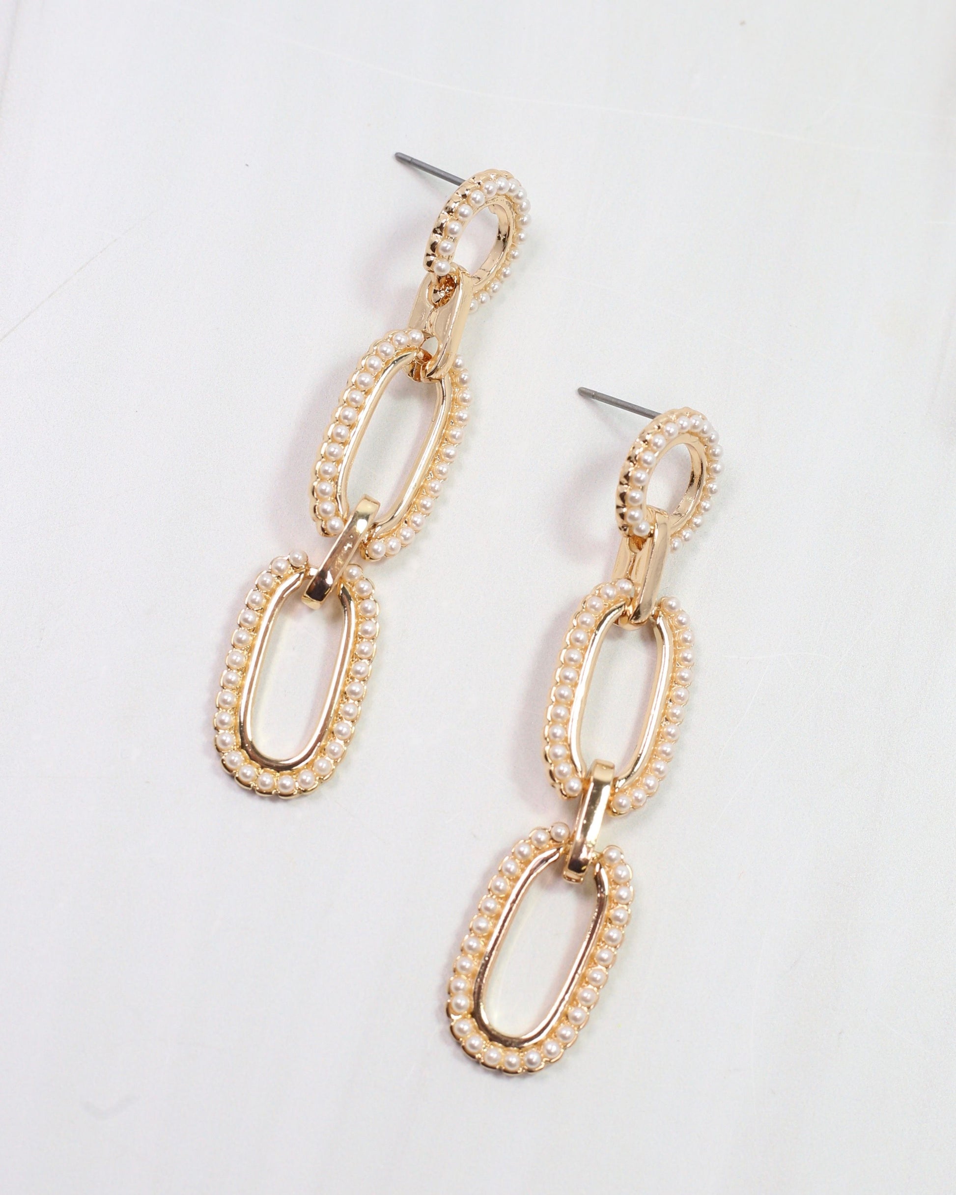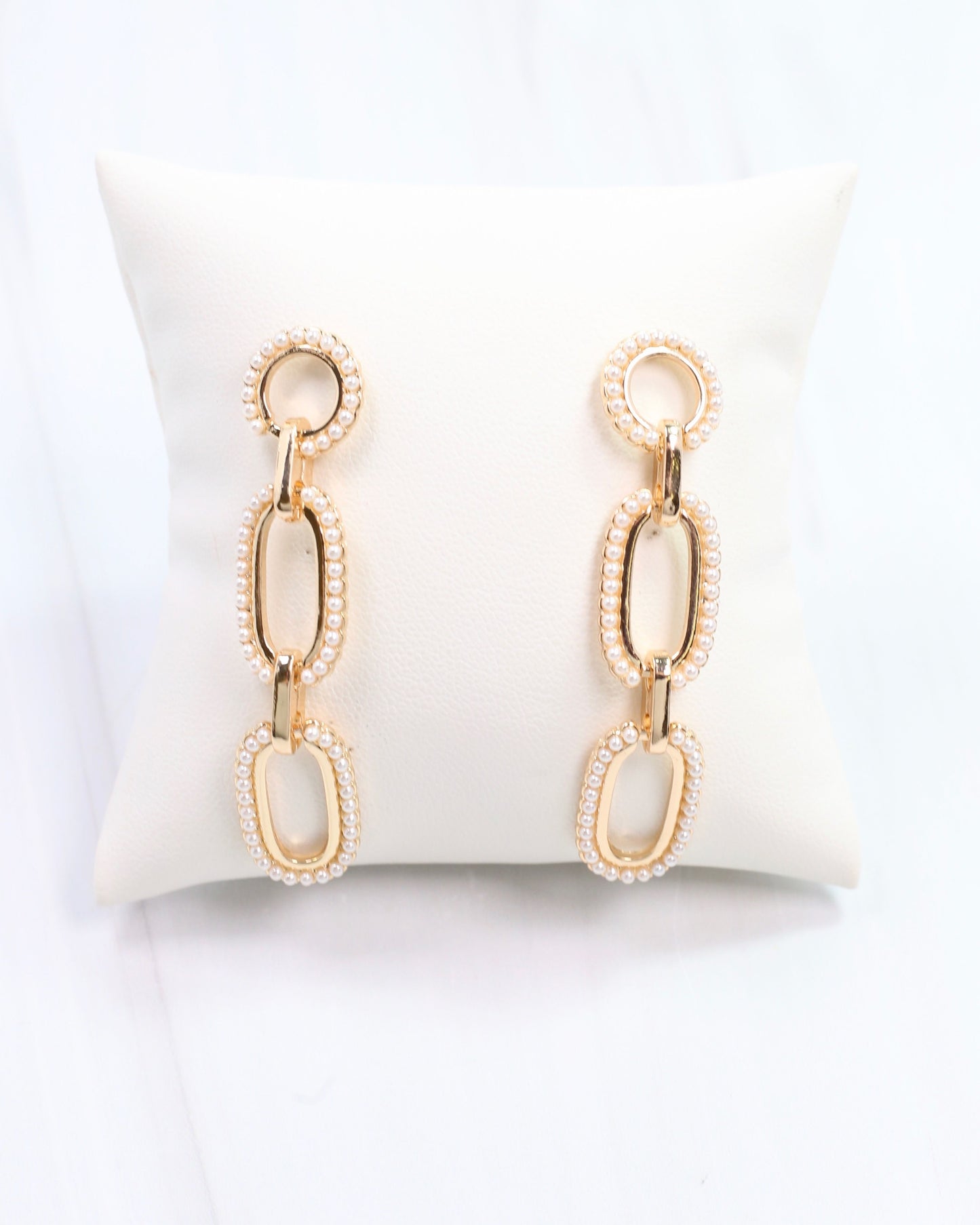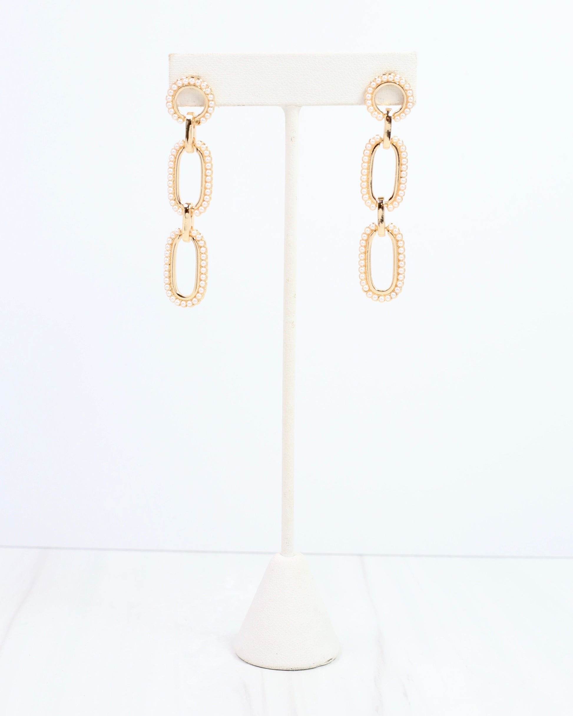 Add a touch of whimsy to your look with the Lettie Link Post Earring Pearl. Featuring a playful triple link design adorned with delicate pearl trim, these gold earrings bring a fresh, fun sparkle to any outfit. Perfect for mixing elegance with a dash of charm!