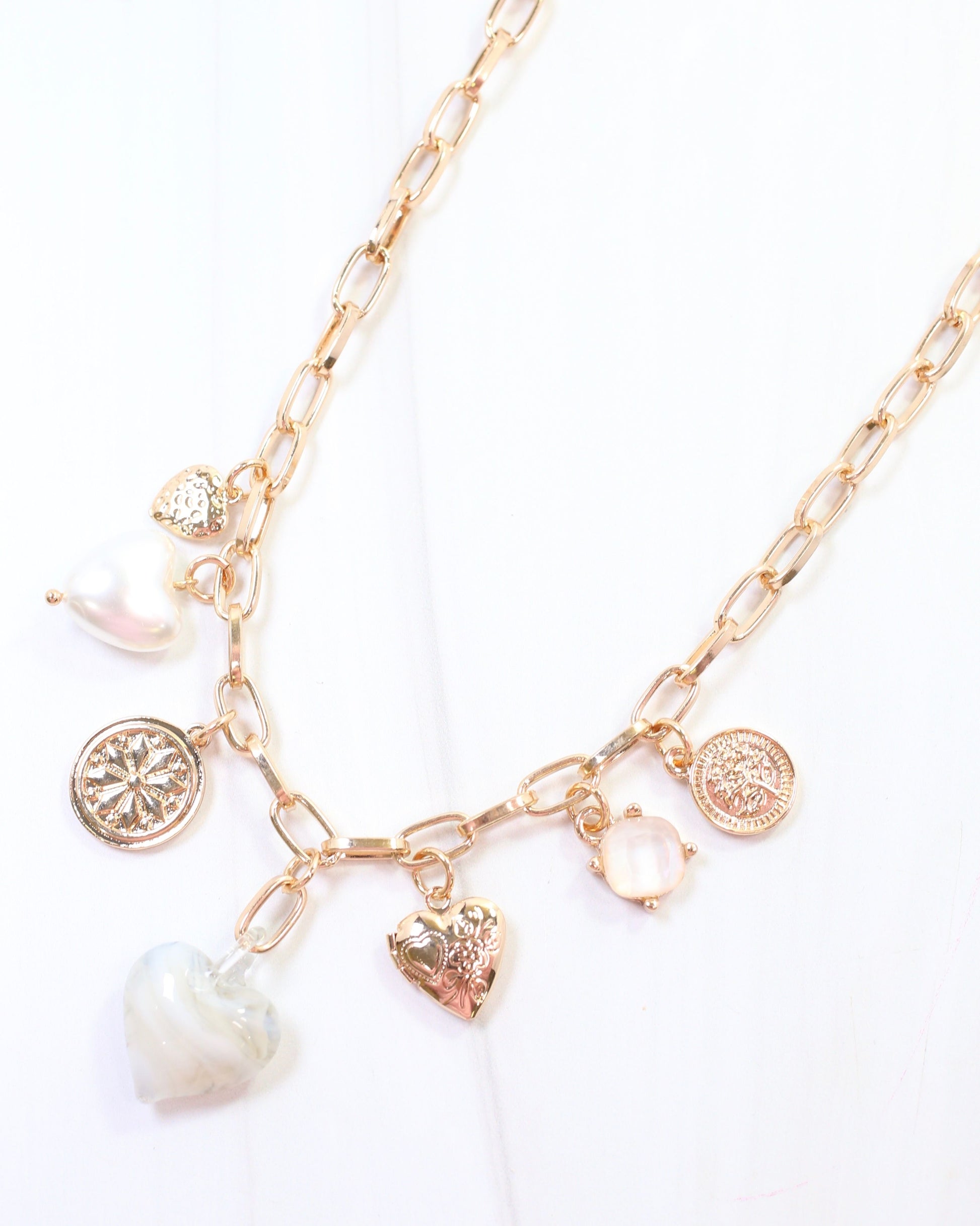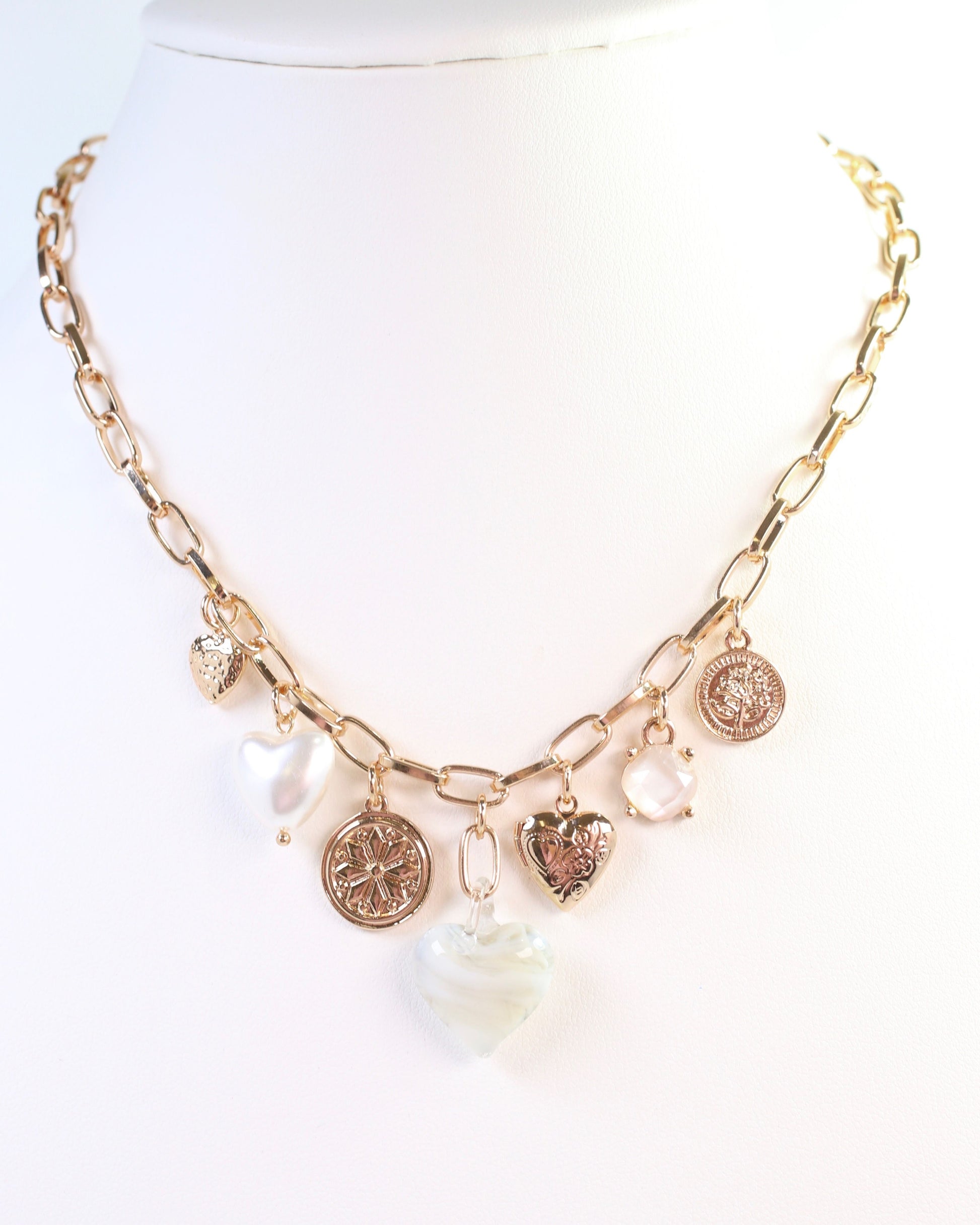 Elevate your style with the Linden Heart Charm Necklace in Gray, featuring seven unique charms including an acetate heart drop, a classic coin, a pearl heart, and a luminous opal stone.
