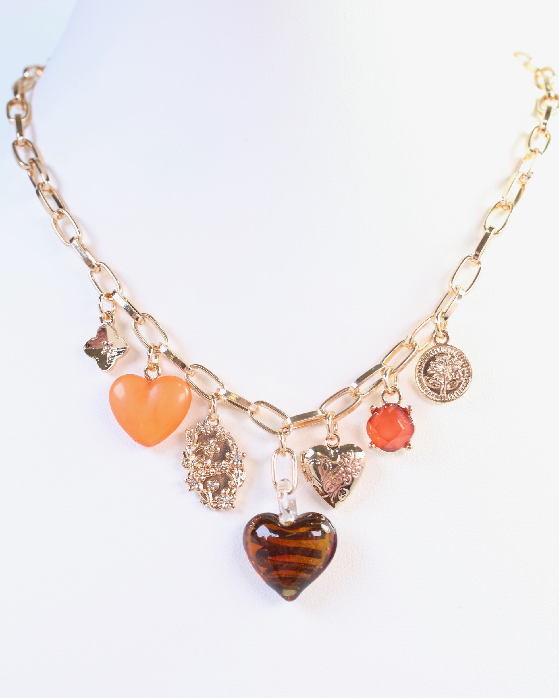 Elevate your style with the Linden Heart Charm Necklace in Topaz, featuring seven unique charms including an acetate heart drop, a classic coin, a pearl heart, and a luminous opal stone.