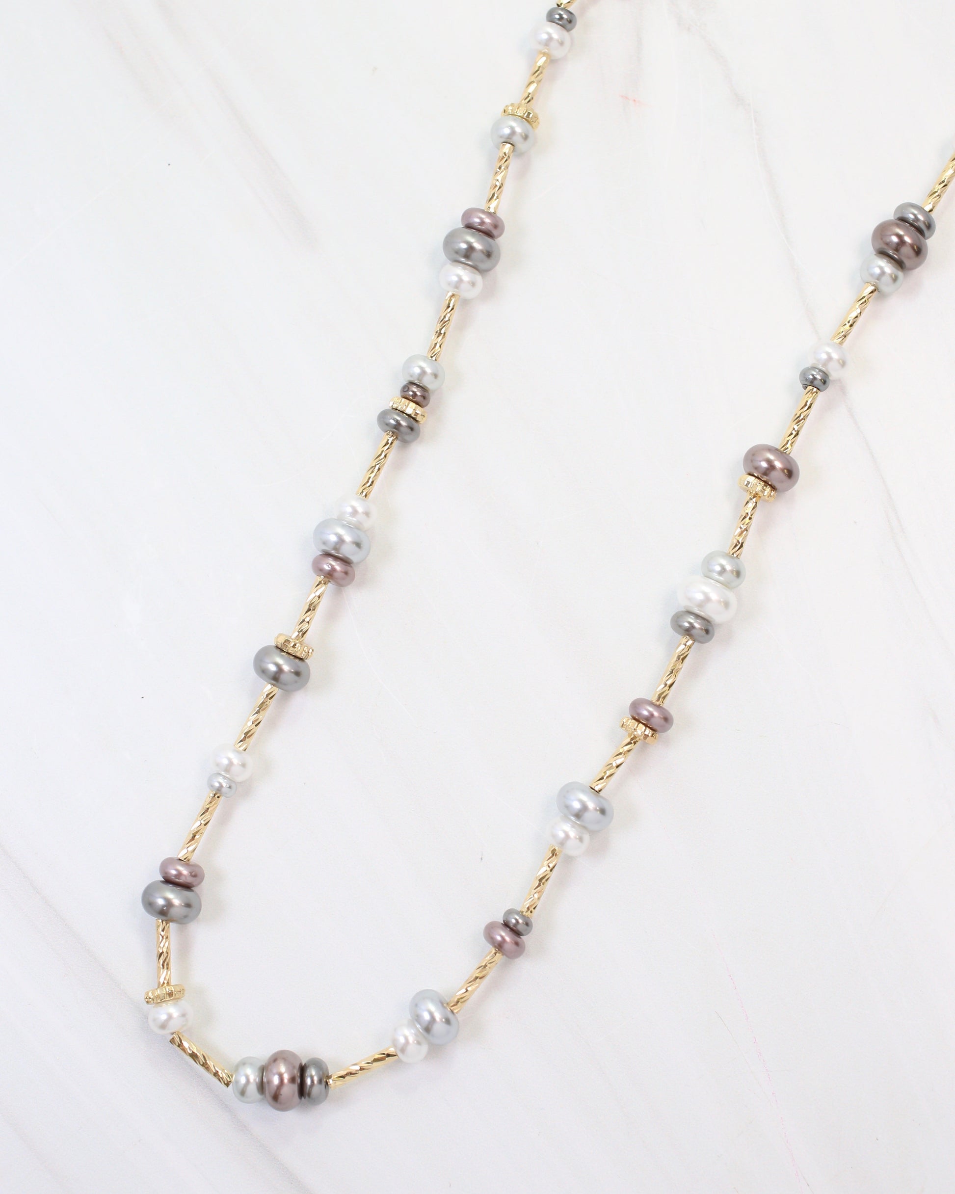 Elevate your style with the Lola 18" Beaded Necklace in grey, featuring elegant gunmetal beads beautifully paired with pearl and gold accents. This versatile piece adds a chic touch to everyday outfits and effortlessly complements your look for a night out. Its refined design makes it a must-have accessory for any fashionable wardrobe.