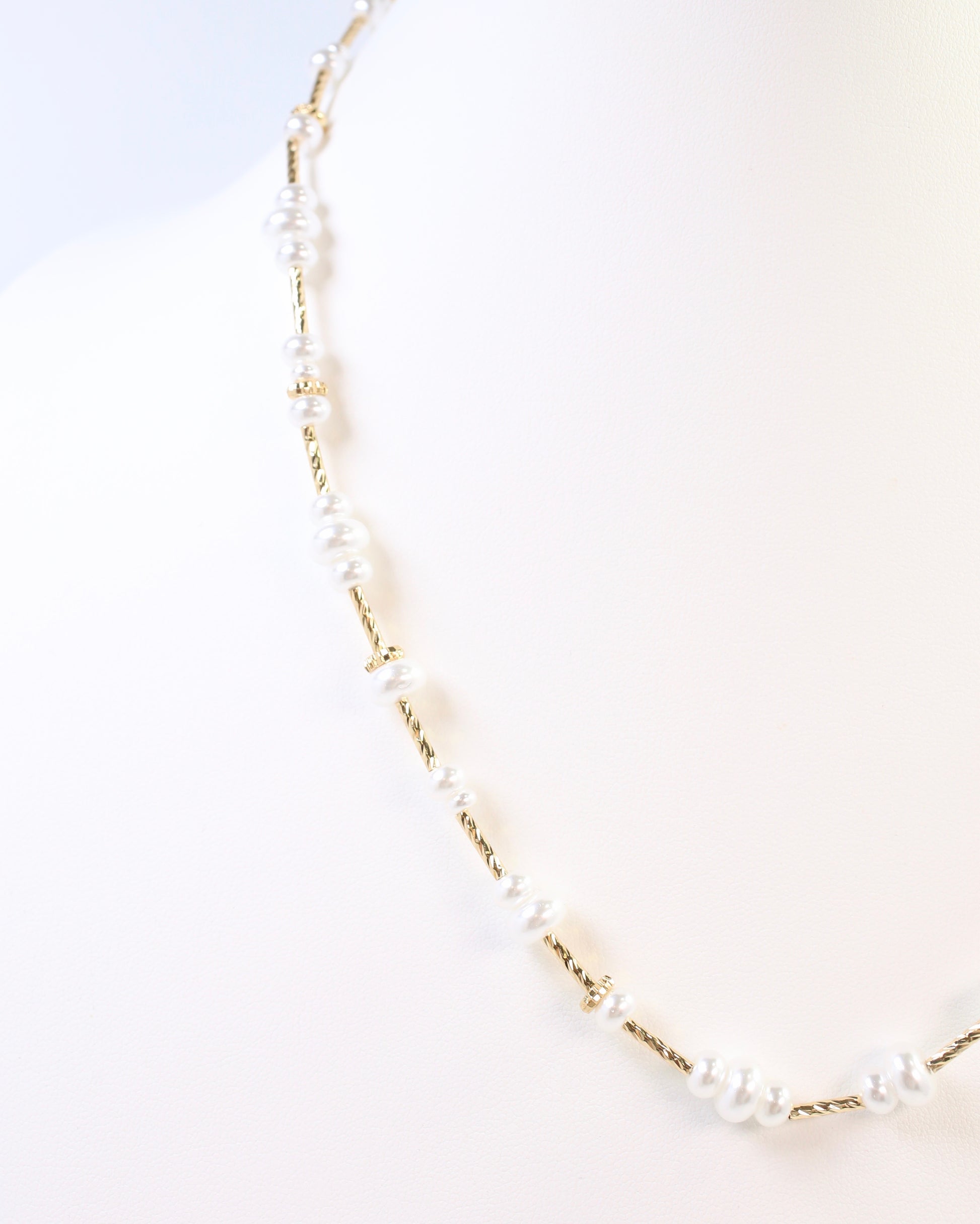 The Lola 18" Beaded Necklace combines elegant pearls with subtle gold beading, creating a timeless accessory that complements any outfit. Whether worn as a beautiful everyday necklace or a chic statement piece for a night out, it adds a refined touch of sophistication to your look.