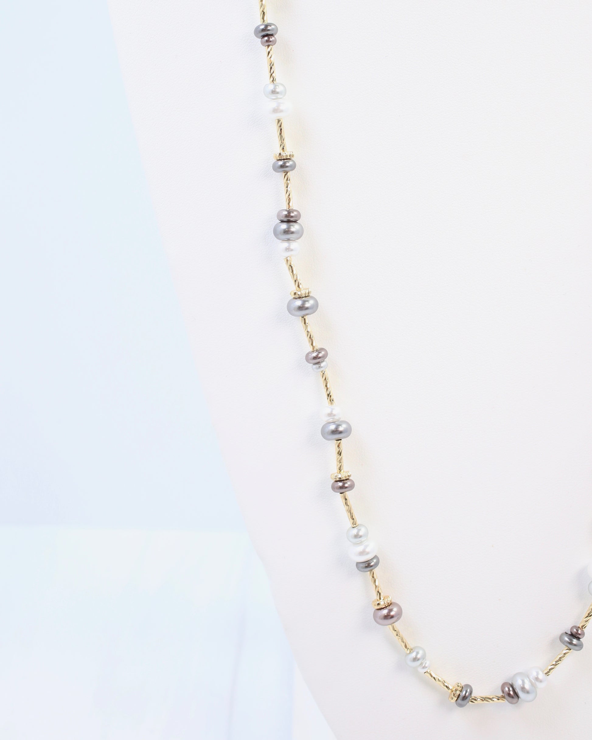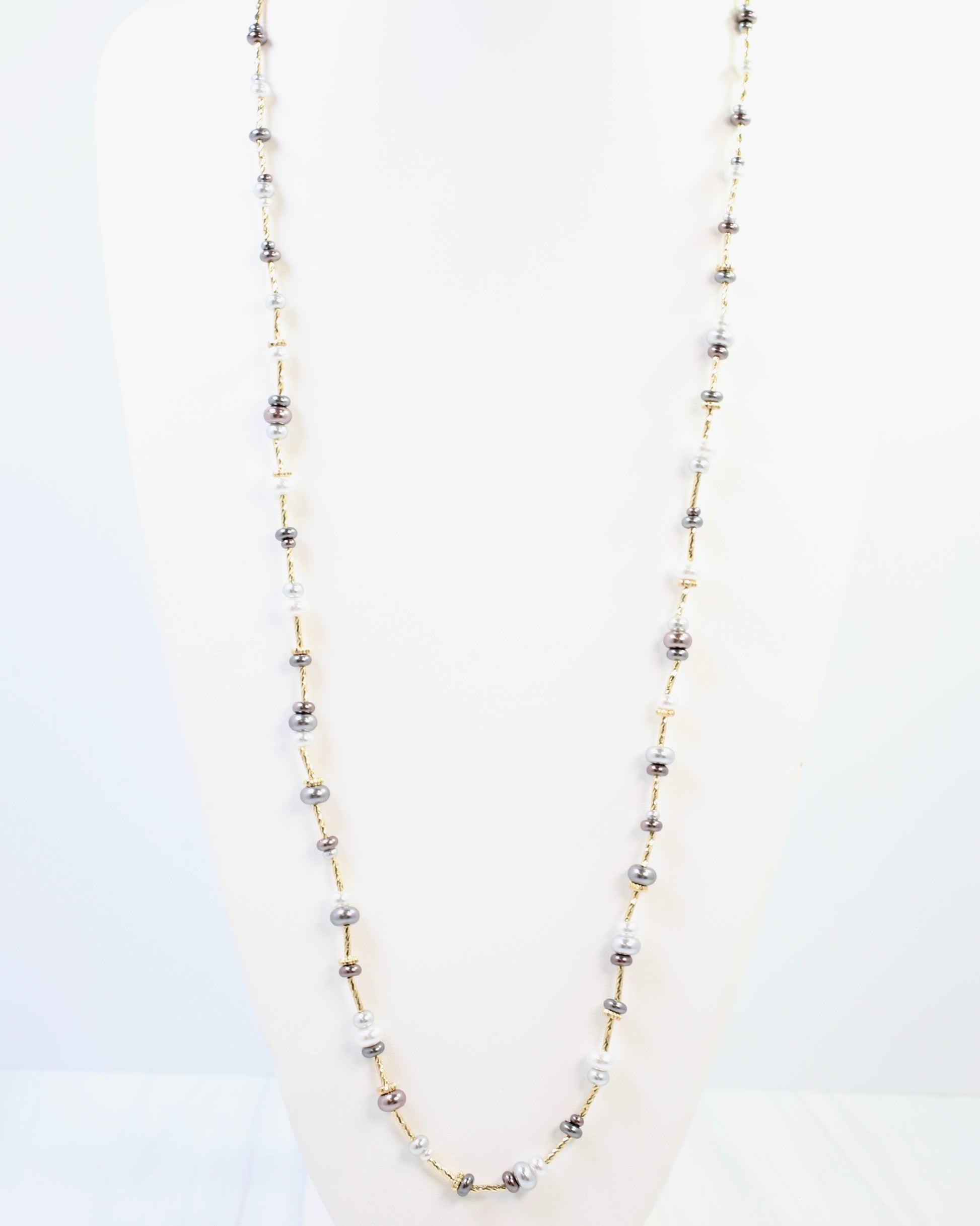 Elevate your style with the Lola 37" Beaded Necklace in grey, featuring elegant gunmetal beads beautifully paired with pearl and gold accents. This versatile piece adds a chic touch to everyday outfits and effortlessly complements your look for a night out. Its refined design makes it a must-have accessory for any fashionable wardrobe.
