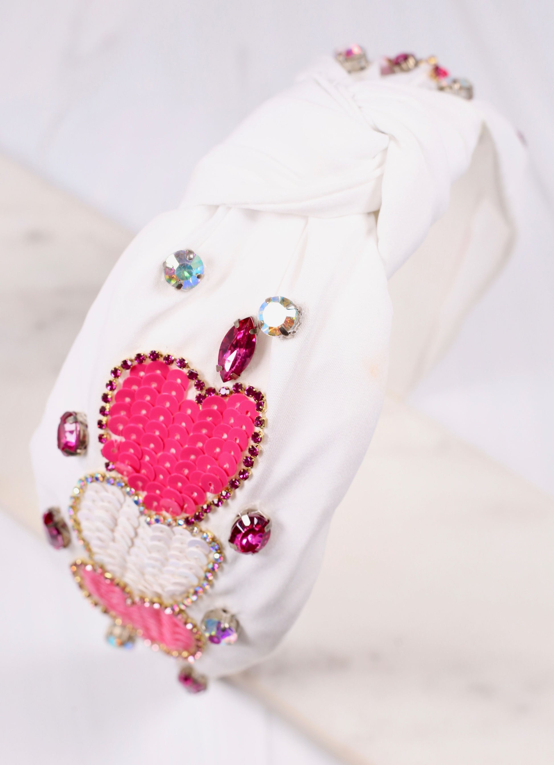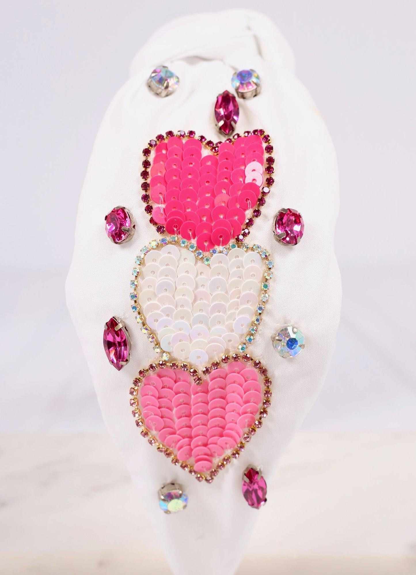 This fabric headband features three sequin hearts outlined in rhinestones for a Valentine's Day ready look! It has a top knot accent and gemstones as well.