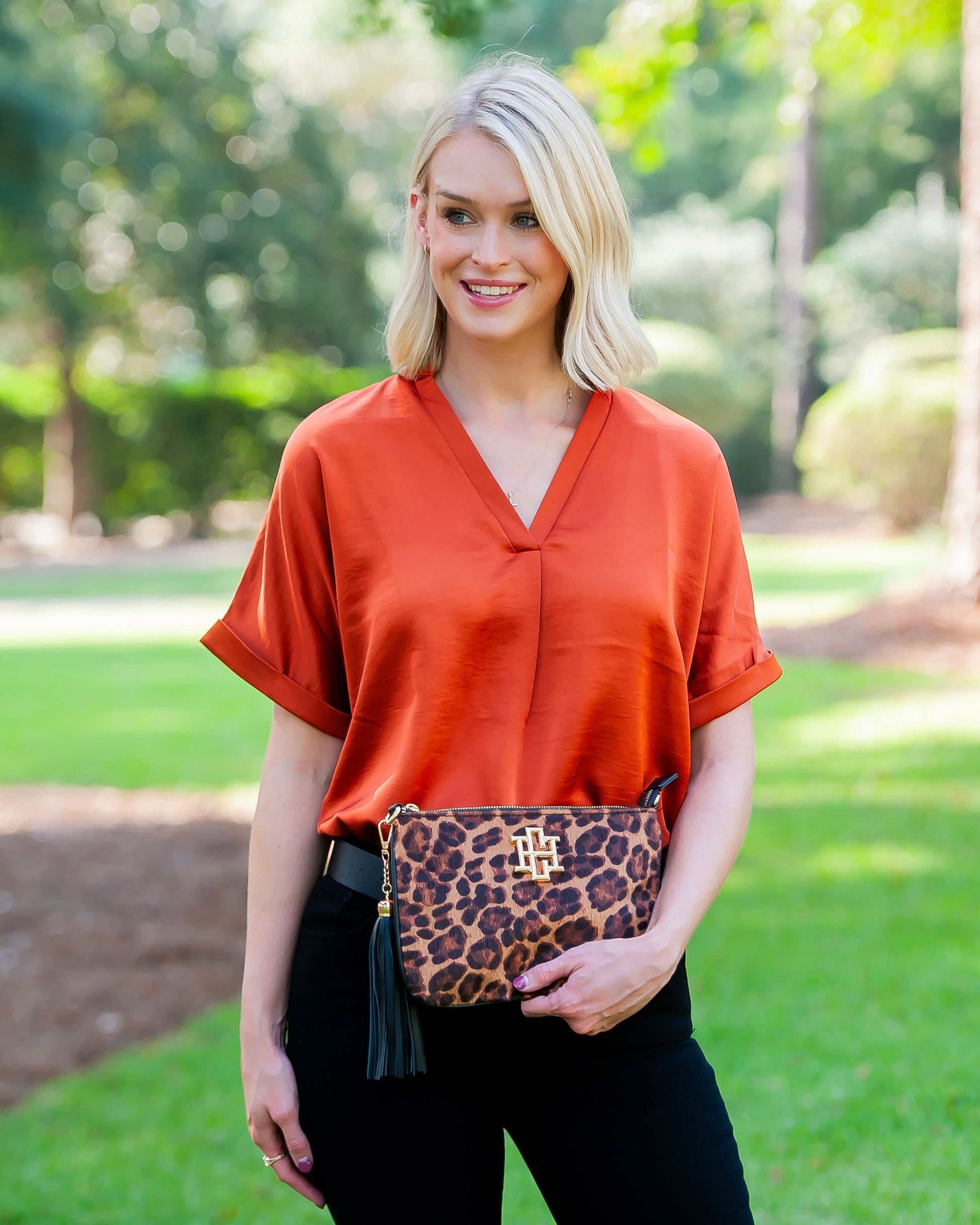 The Madelyn Clutch/Crossbody in Spotted Saddle combines sleek envelope style with practical design, featuring a secure zipper and a removable tassel detail. Designed for everyday versatility, it can be carried as a clutch or worn crossbody with a chain strap accented by a comfortable shoulder pad, adding a chic touch to any outfit.