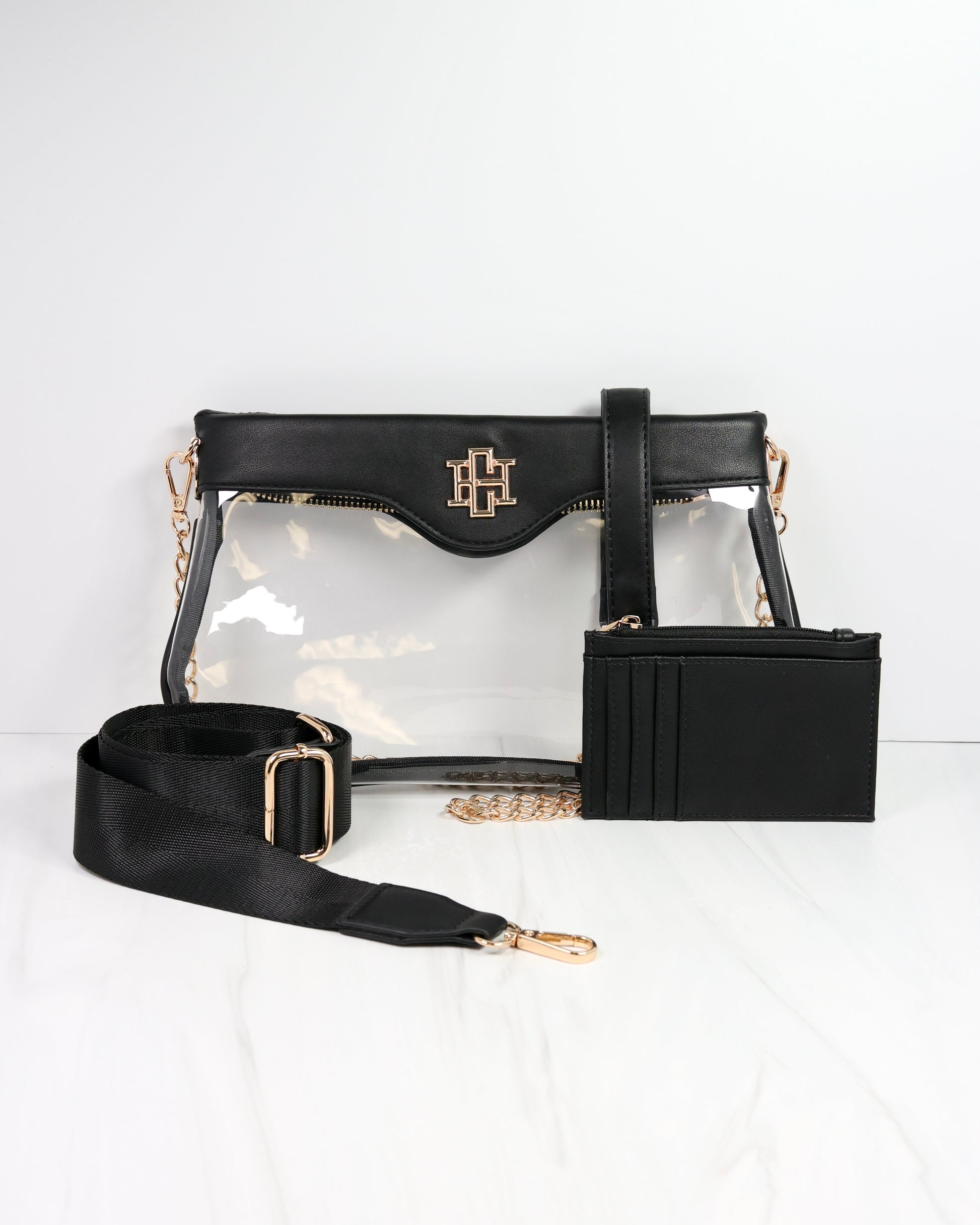 The Madi Clear Crossbody in Black is the perfect accessory for game day, combining style and practicality. Its transparent design meets stadium requirements, while the chic chain strap adds a fashionable touch. Easily pair it with our purse chains, nylon strap, or Molly Card Holder to customize your look and keep essentials close at hand.