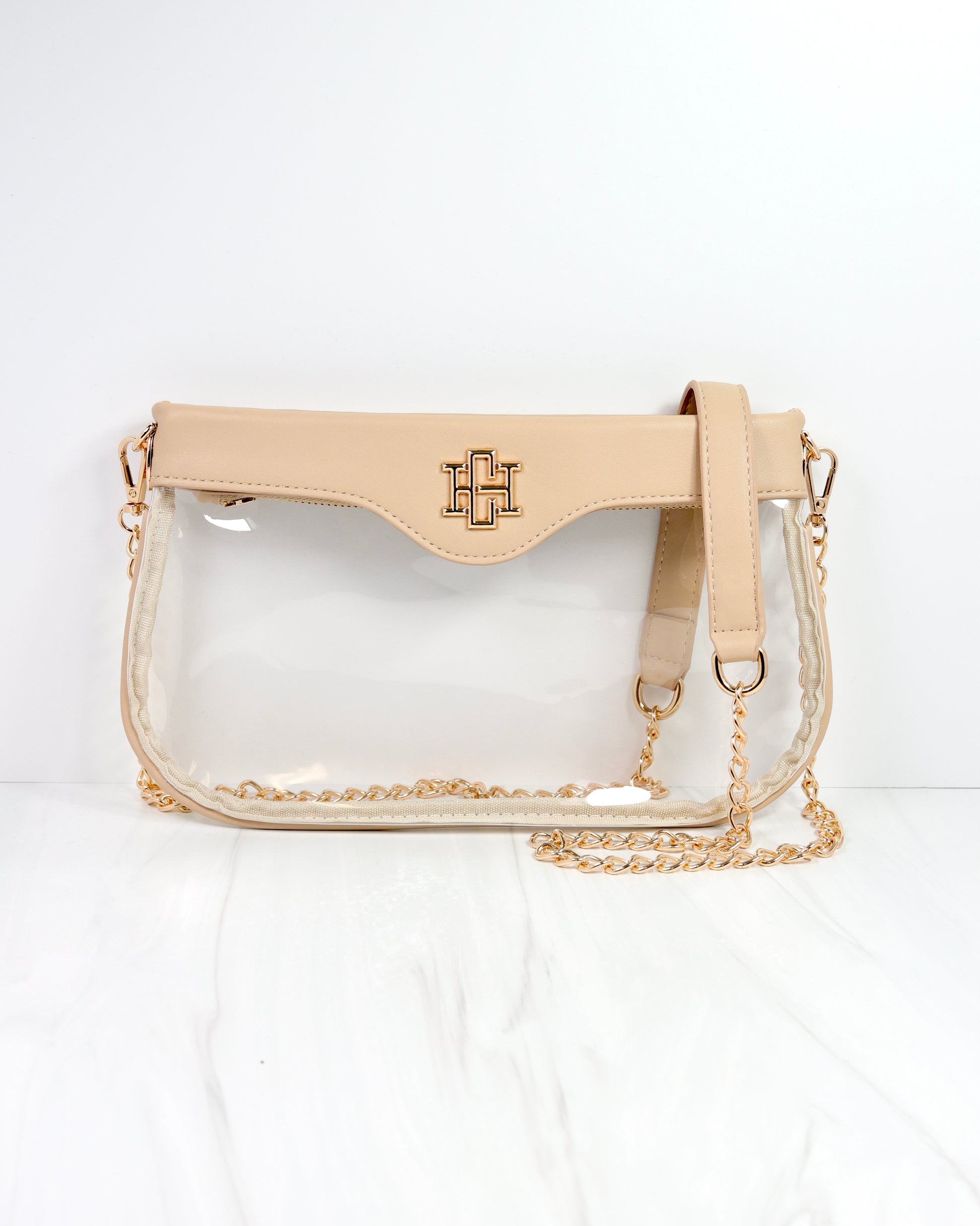 The Madi Clear Crossbody in Nude is the perfect accessory for game day, combining style and practicality. Its transparent design meets stadium requirements, while the chic chain strap adds a fashionable touch. Easily pair it with our purse chains, nylon strap, or Molly Card Holder to customize your look and keep essentials close at hand.