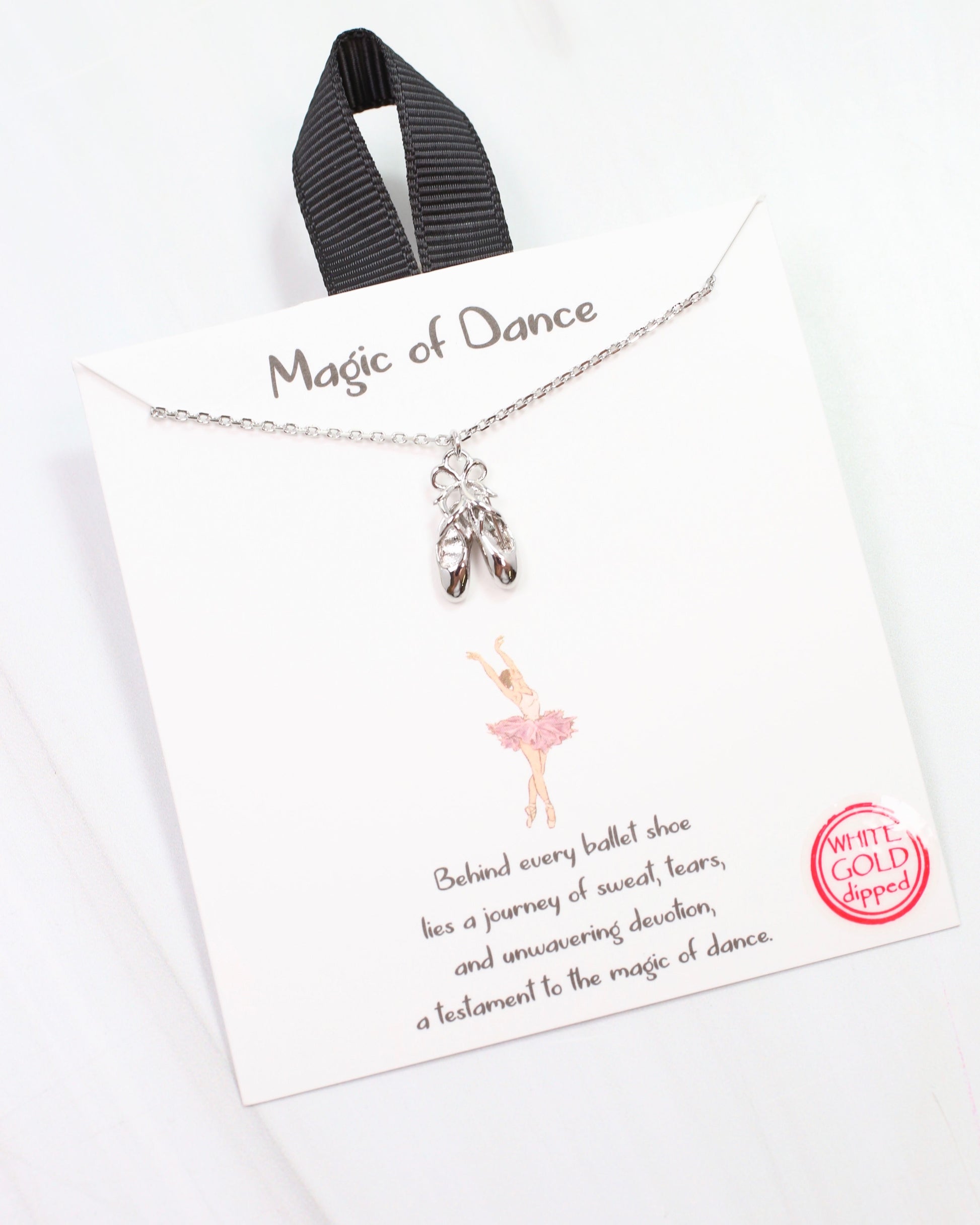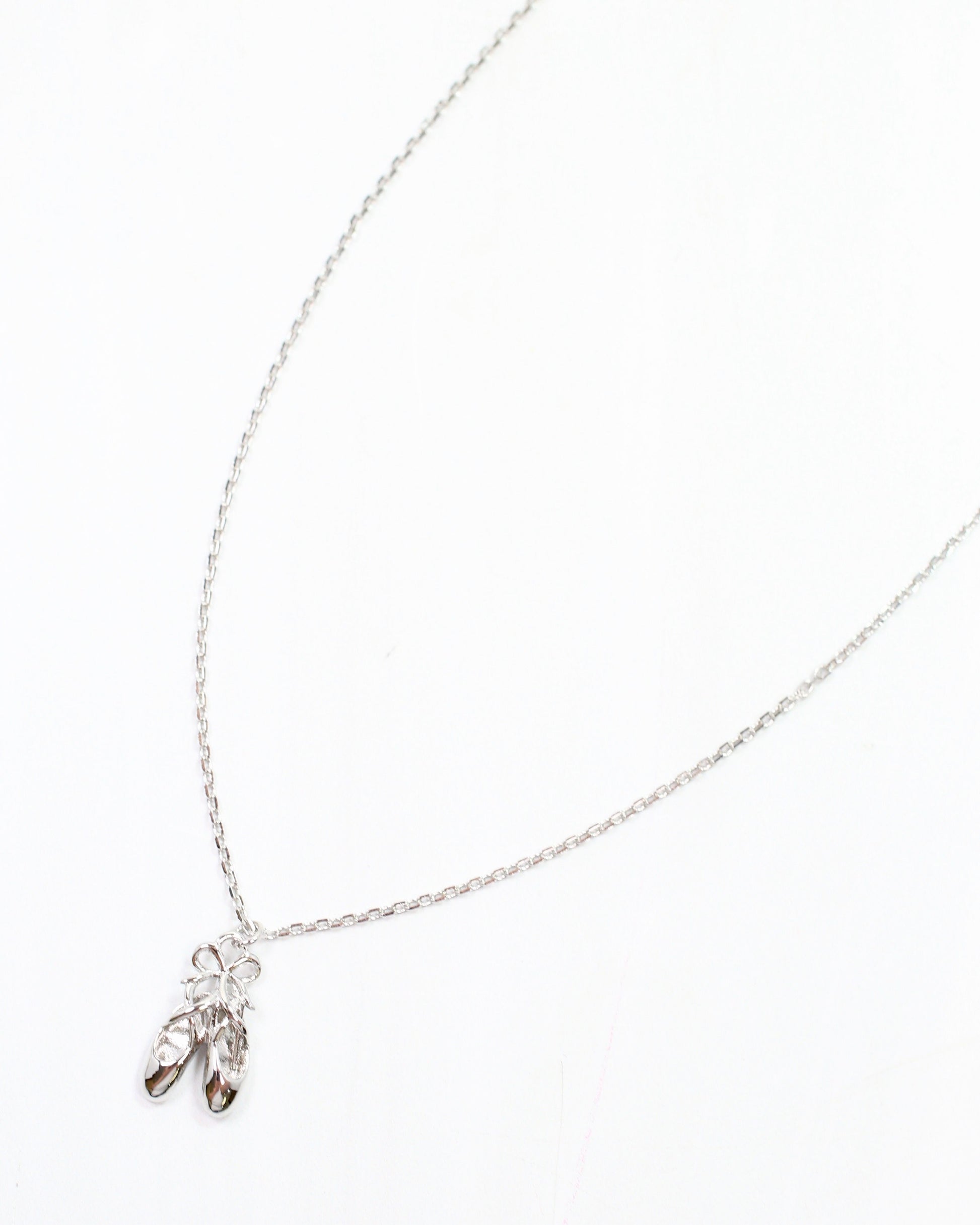 Capture the joy of dance with this playful white gold-dipped necklace featuring pointe shoes and a sweet bow detail.