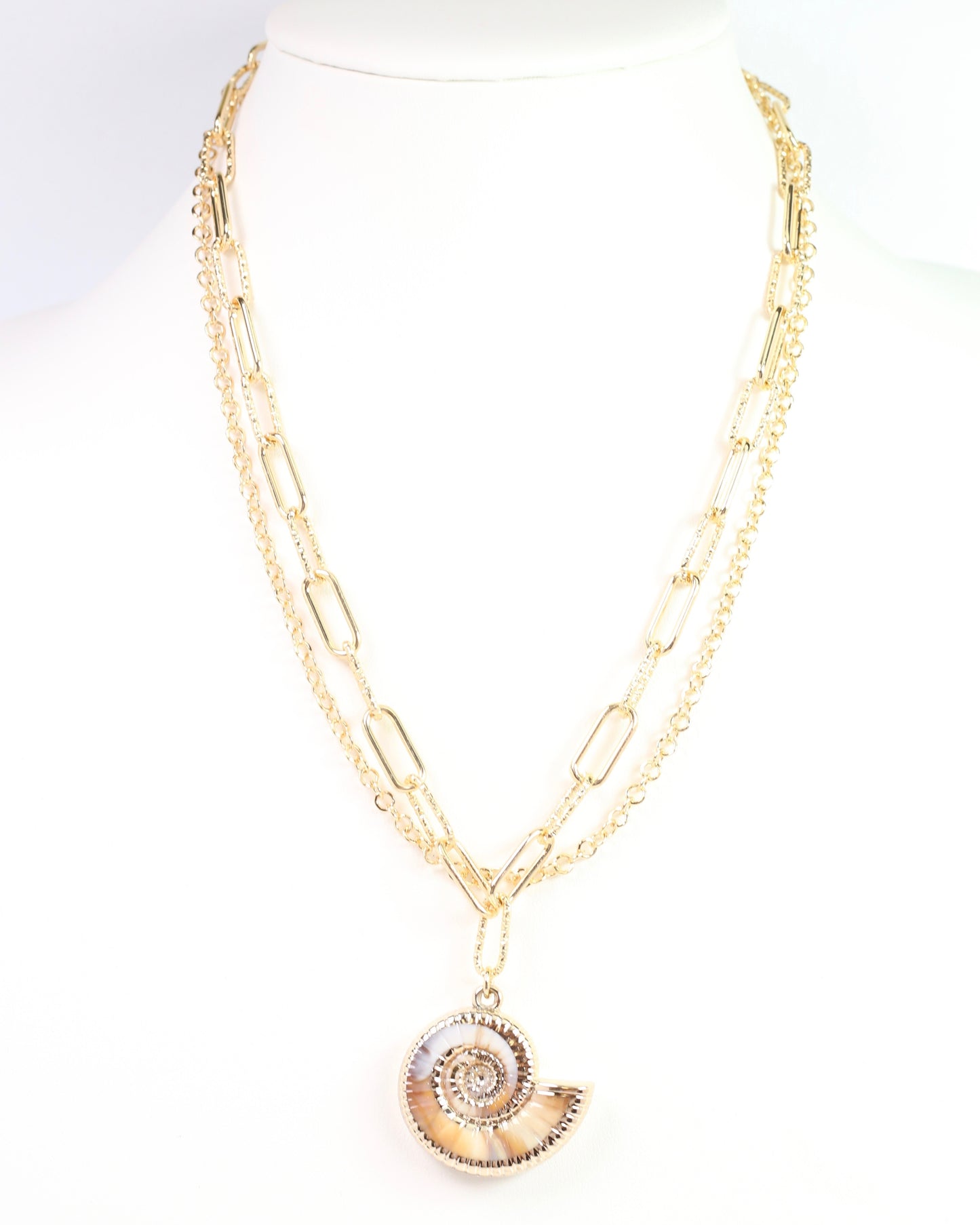 Elevate your style with the Marina Layered Necklace in Gold. Featuring a chic double-layered paperclip chain, this necklace showcases a stunning nautilus pendant with a delicate shell inlay. Perfect for adding a touch of elegance and coastal charm to any outfit.