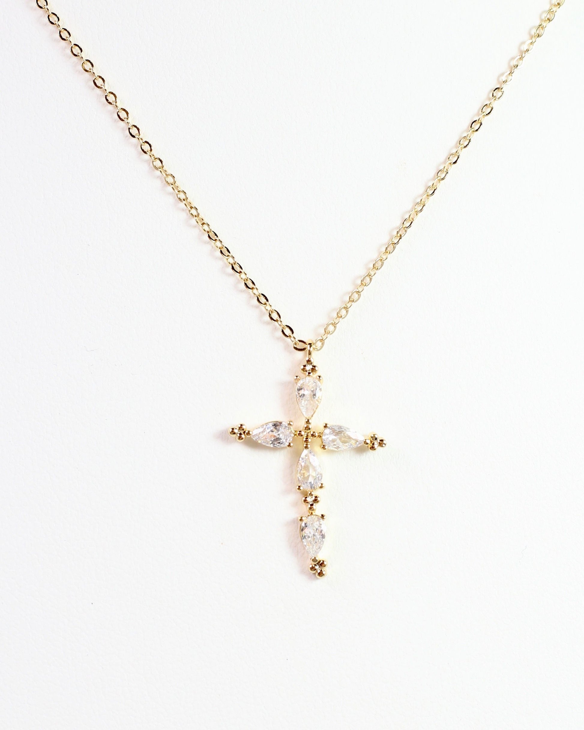 Add a touch of sparkle to your look with the Marla CZ Cross Necklace in Gold. This playful piece features pear-shaped cubic zirconia stones that beautifully line a delicate cross, all set on a dainty gold-dipped chain. Perfect for layering or wearing solo, it’s a charming way to brighten any outfit.