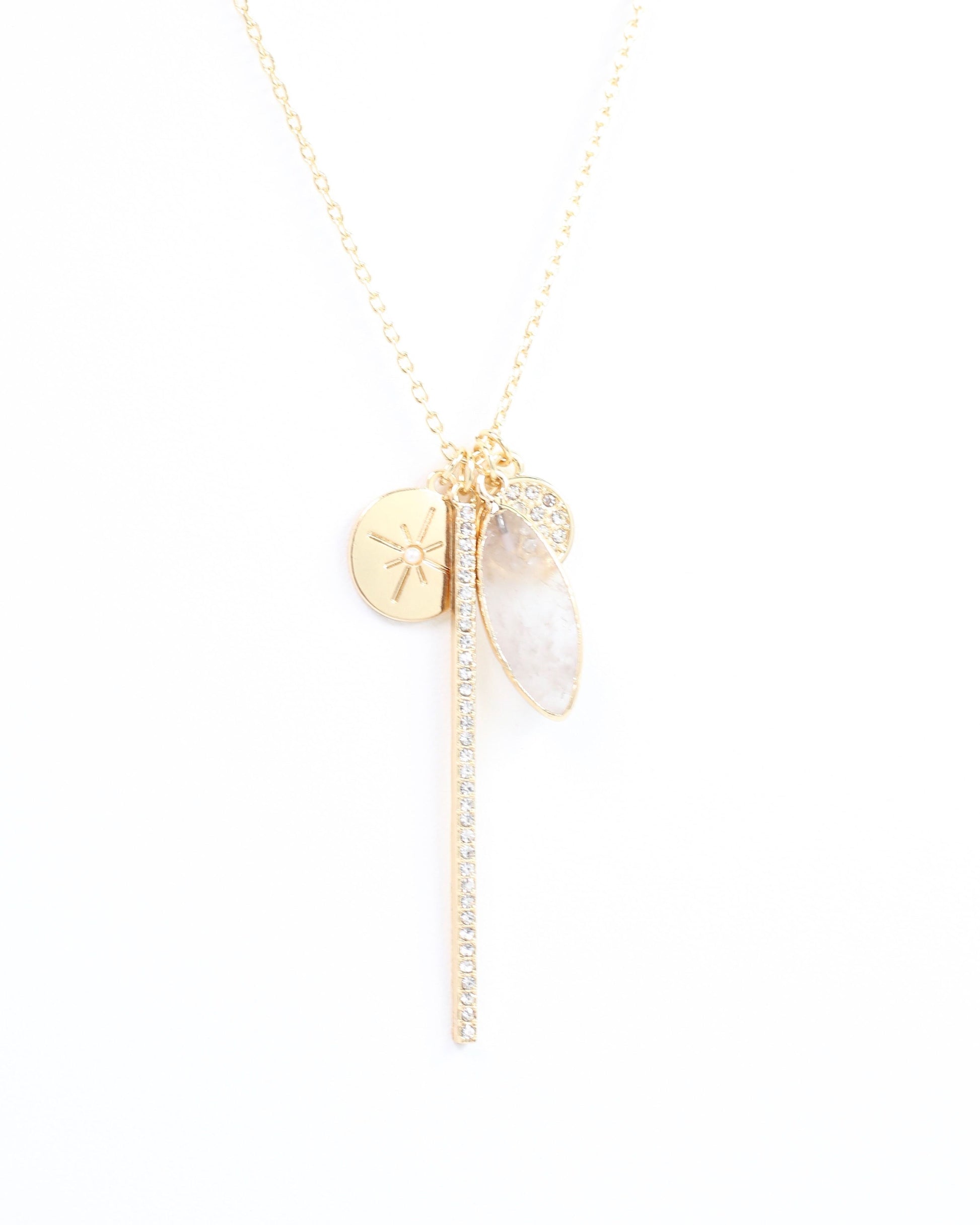 Add a touch of whimsy to your look with the Maryland Long Charm Necklace in Gold. This delicate chain features a sparkling pave bar, a shimmering glass leaf charm, a pave circle, and a playful starburst charm—each adding a little sparkle and personality to your outfit. Perfect for layering or wearing solo, it’s a fun way to brighten your day with subtle, charming details.
