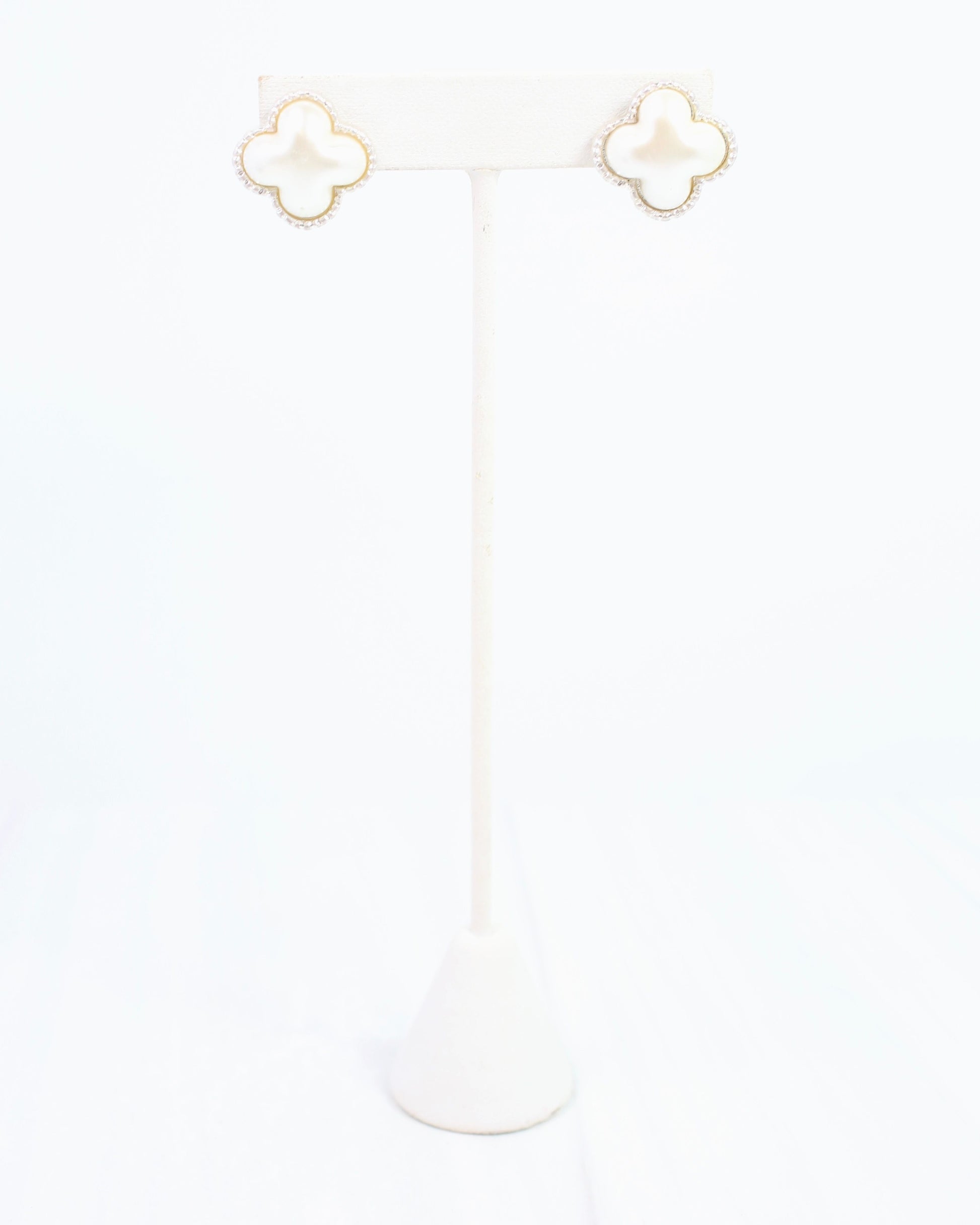 This elegant clover stud earring features a puffed pearl center in a silver setting. It has a vintage yet trendy look to accessorize any look.