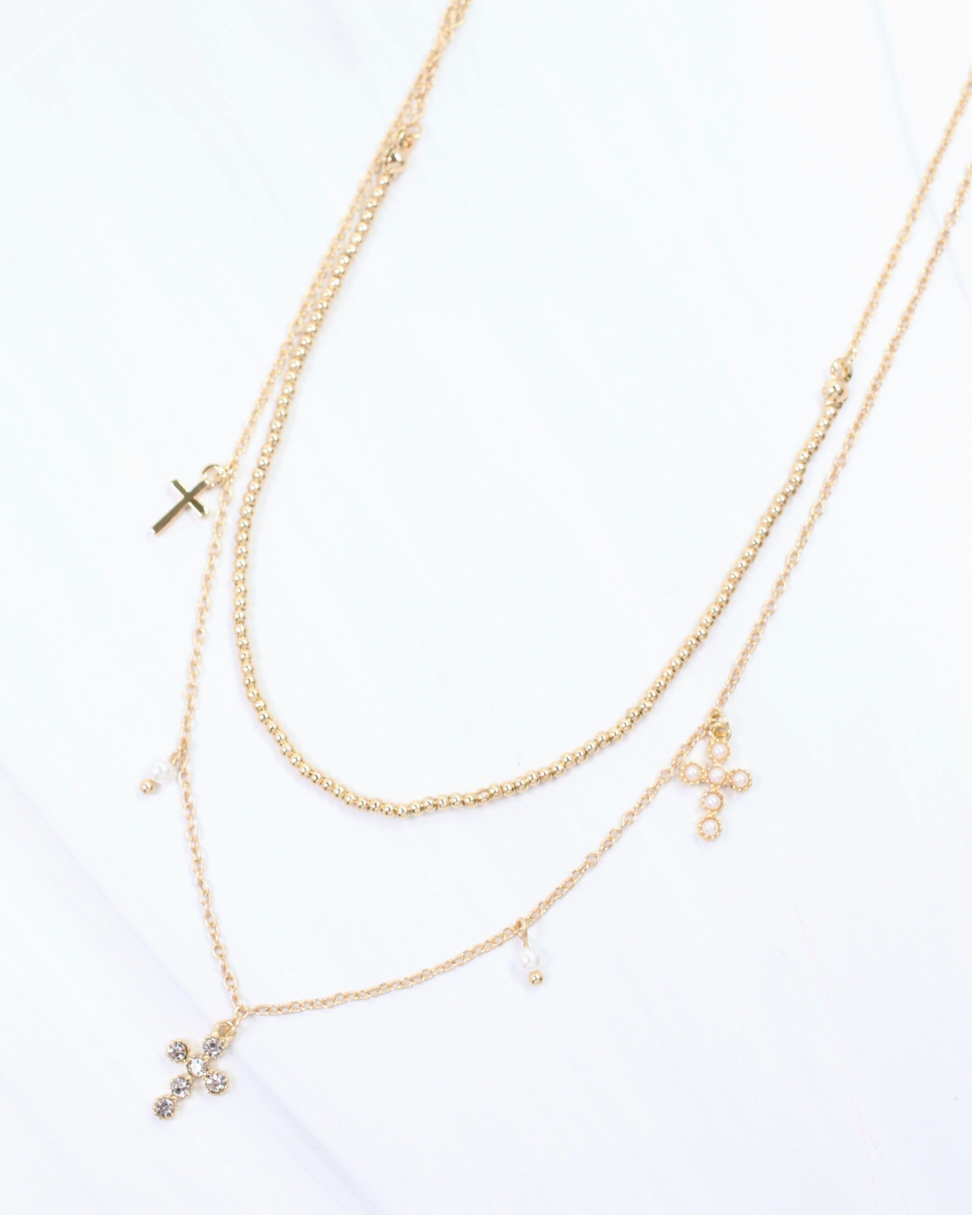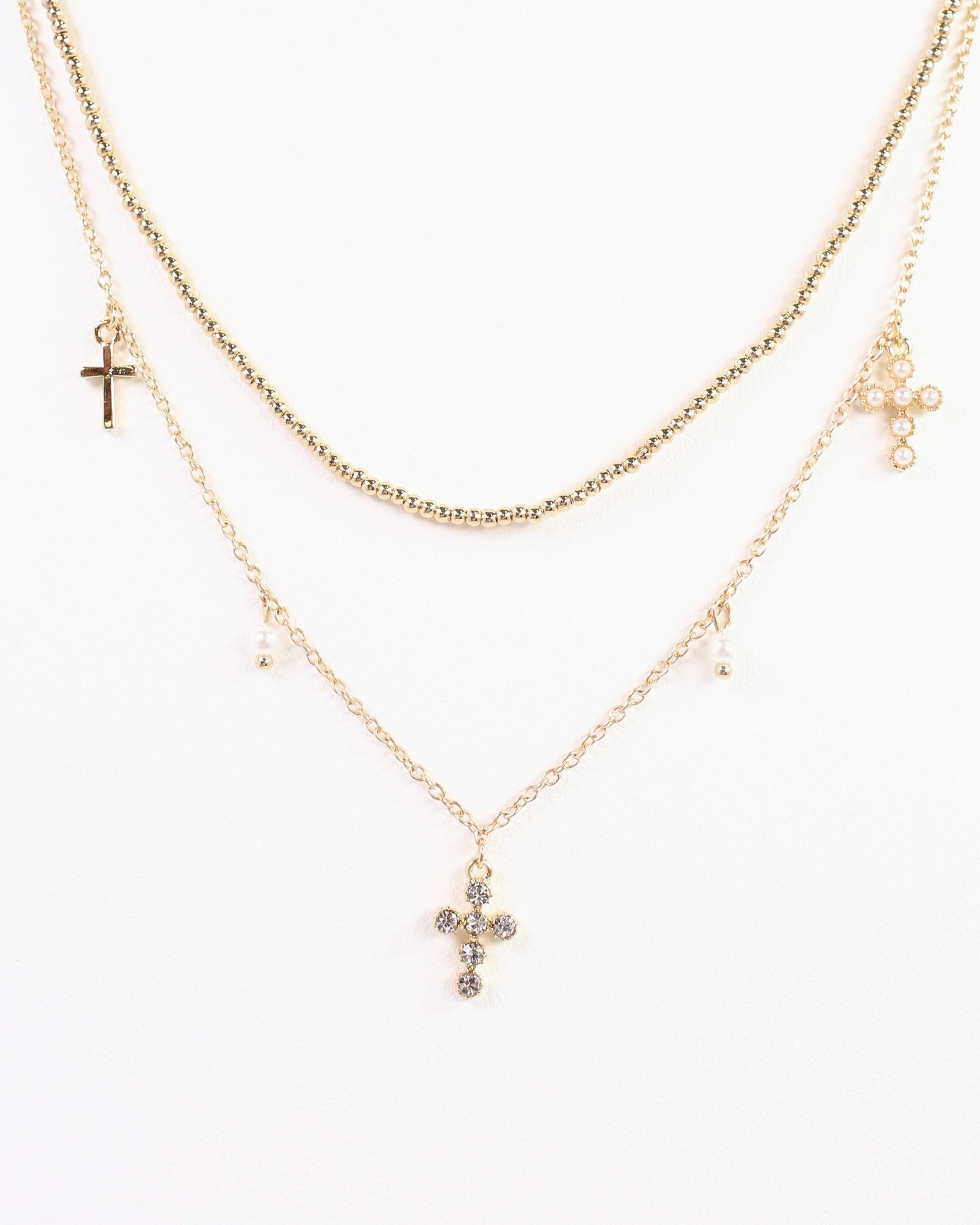 Elevate your style with the Maya Cross and Pearl Charm Necklace in Gold. This double-layered piece features a delicate beaded strand paired with a slender chain adorned with three distinct cross charms—gold, pearl, and sparkling CZ—accented by two small dangling pearls. Perfect for adding a chic, layered look that blends elegance with a modern edge.