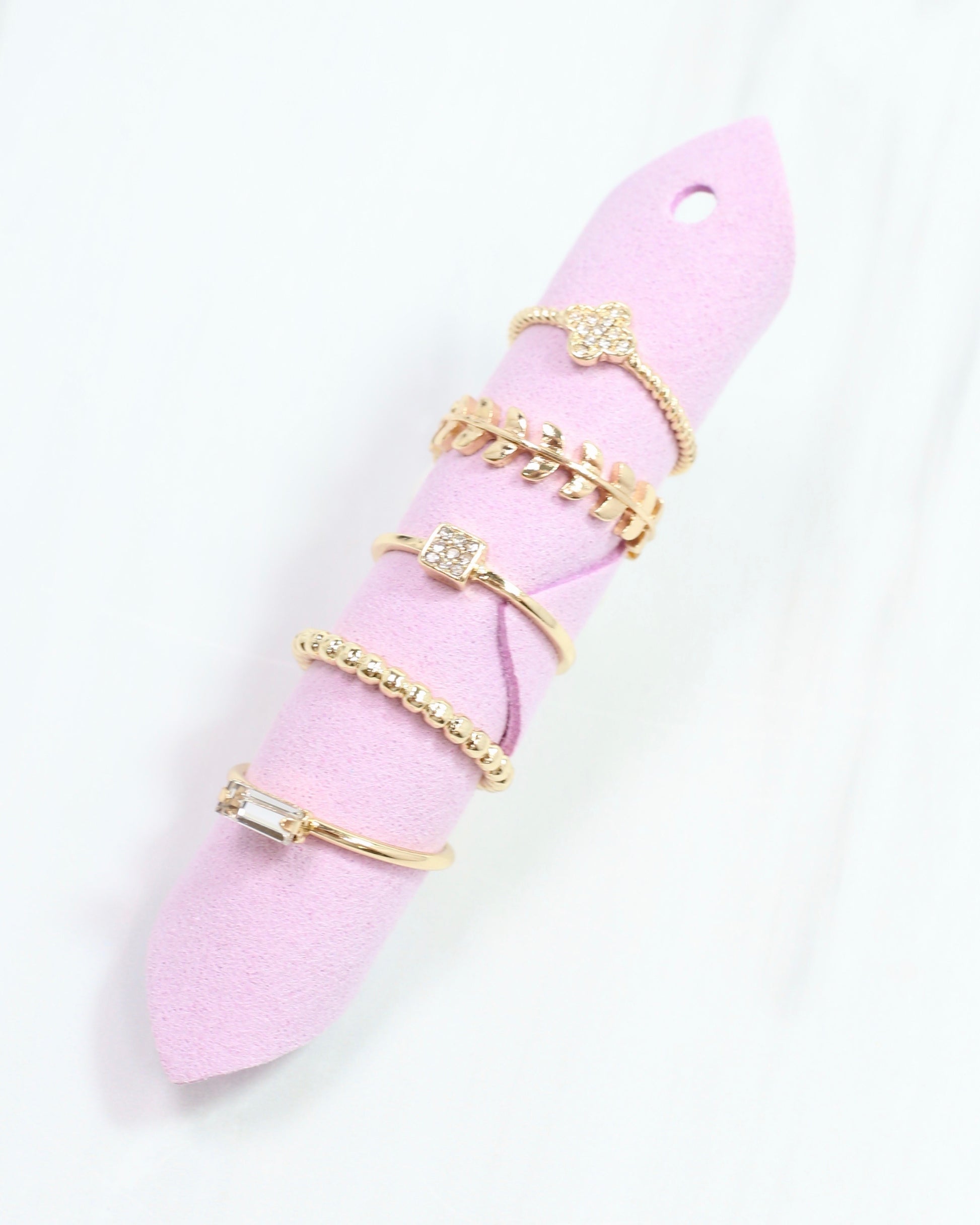 Brighten your look with the McFarlen Ring Set Gold—five playful gold rings featuring pave clover, laurel leaf, rectangular stone, and dotted designs. Mix, match, and stack for endless fun!