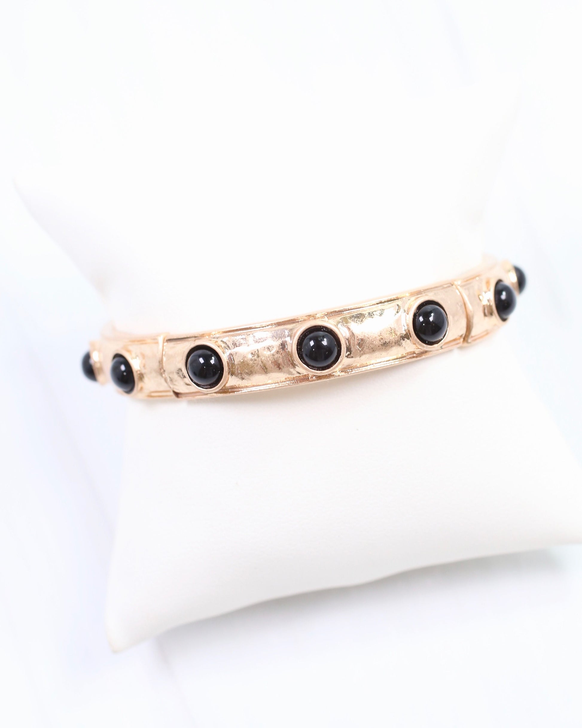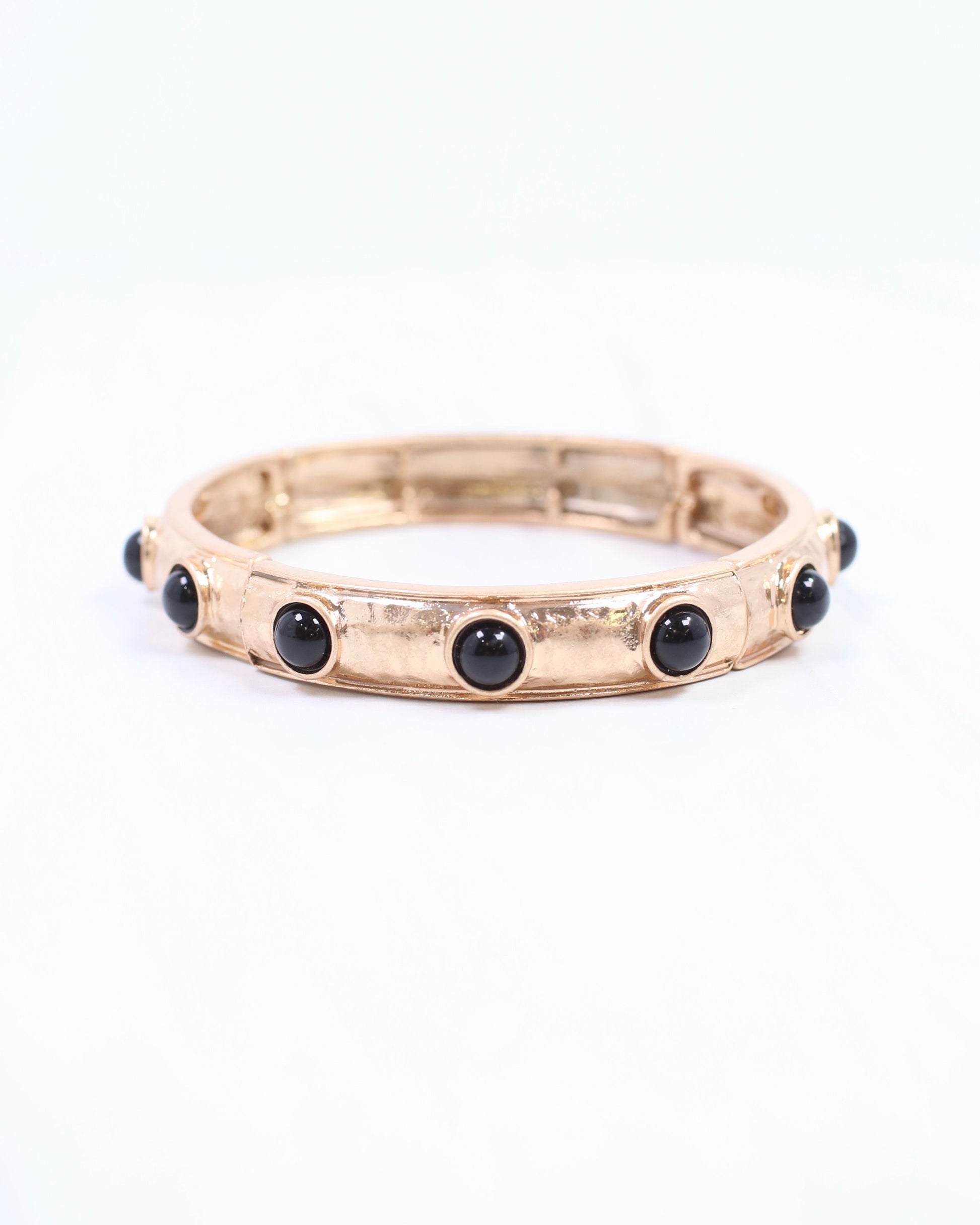 Elevate your style with the McKenna Stone Stretch Bracelet in Black. Featuring hammered worn gold finish and smooth round synthetic stones, this stretch bangle offers a comfortable, flexible fit for most wrists. Its sleek black design makes it ideal for layering or stacking, adding a chic and modern touch to any outfit.
