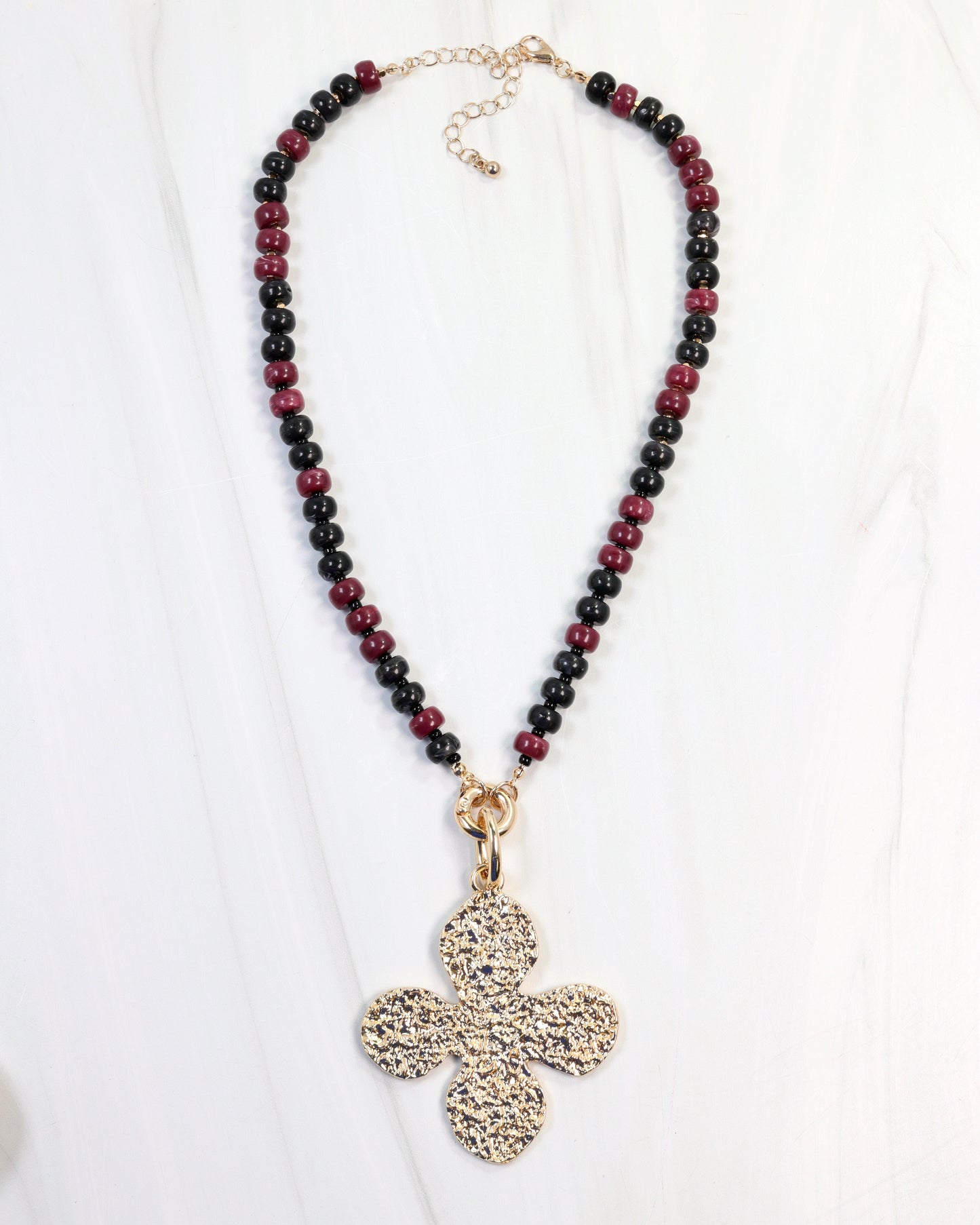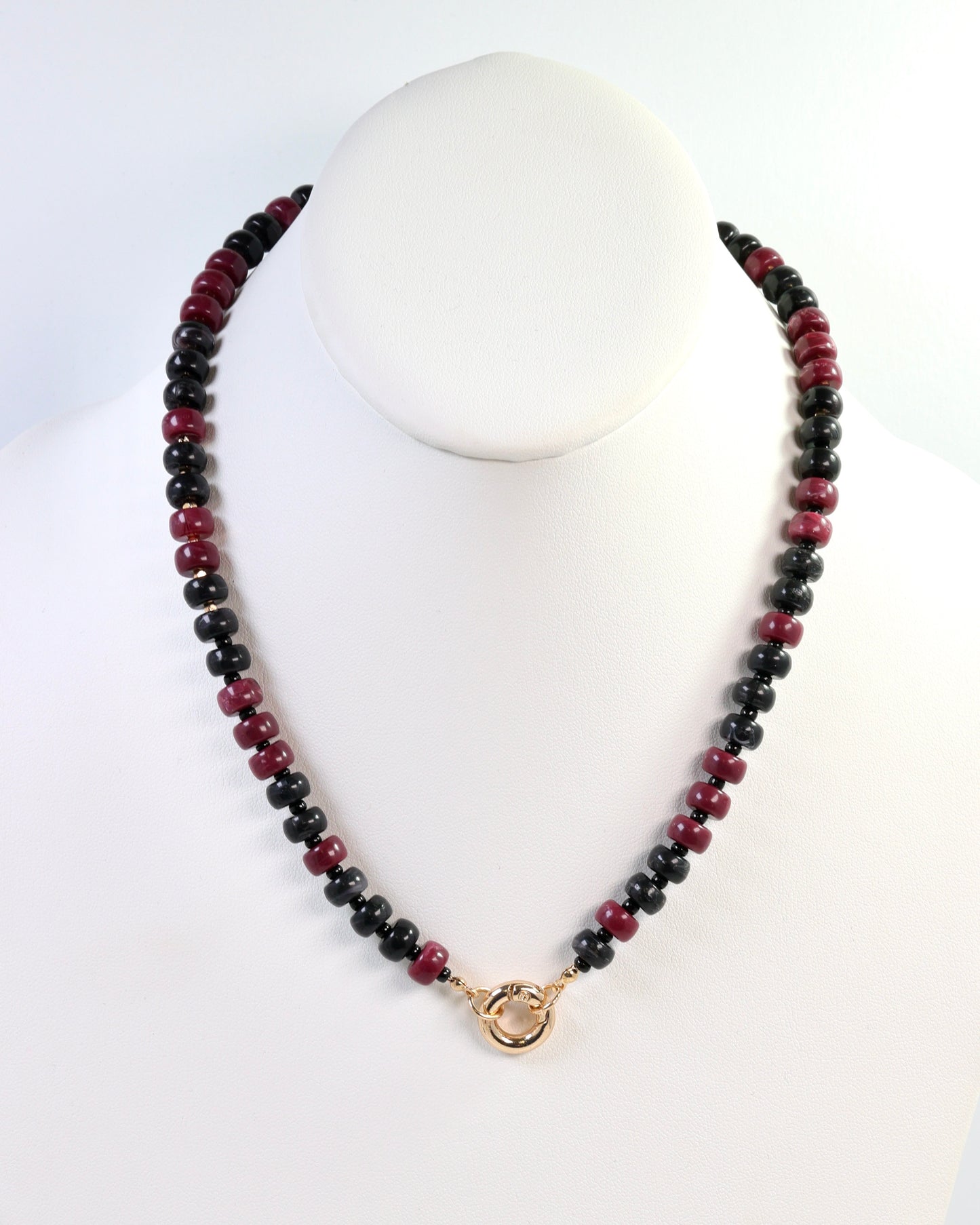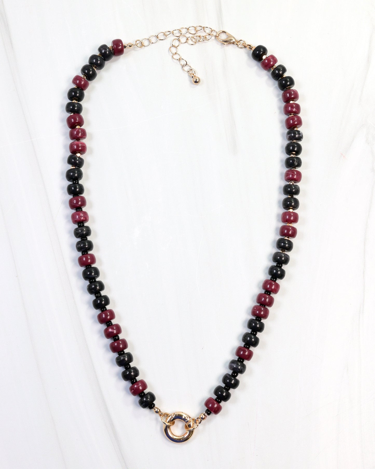 Show your team pride in style with the McLane Stone Necklace featuring bold garnet and black stones. This fashionable piece includes a convenient toggle clasp, allowing you to easily add your favorite charm for a personalized touch. Perfect for game day or everyday wear, it combines spirited design with versatile elegance.