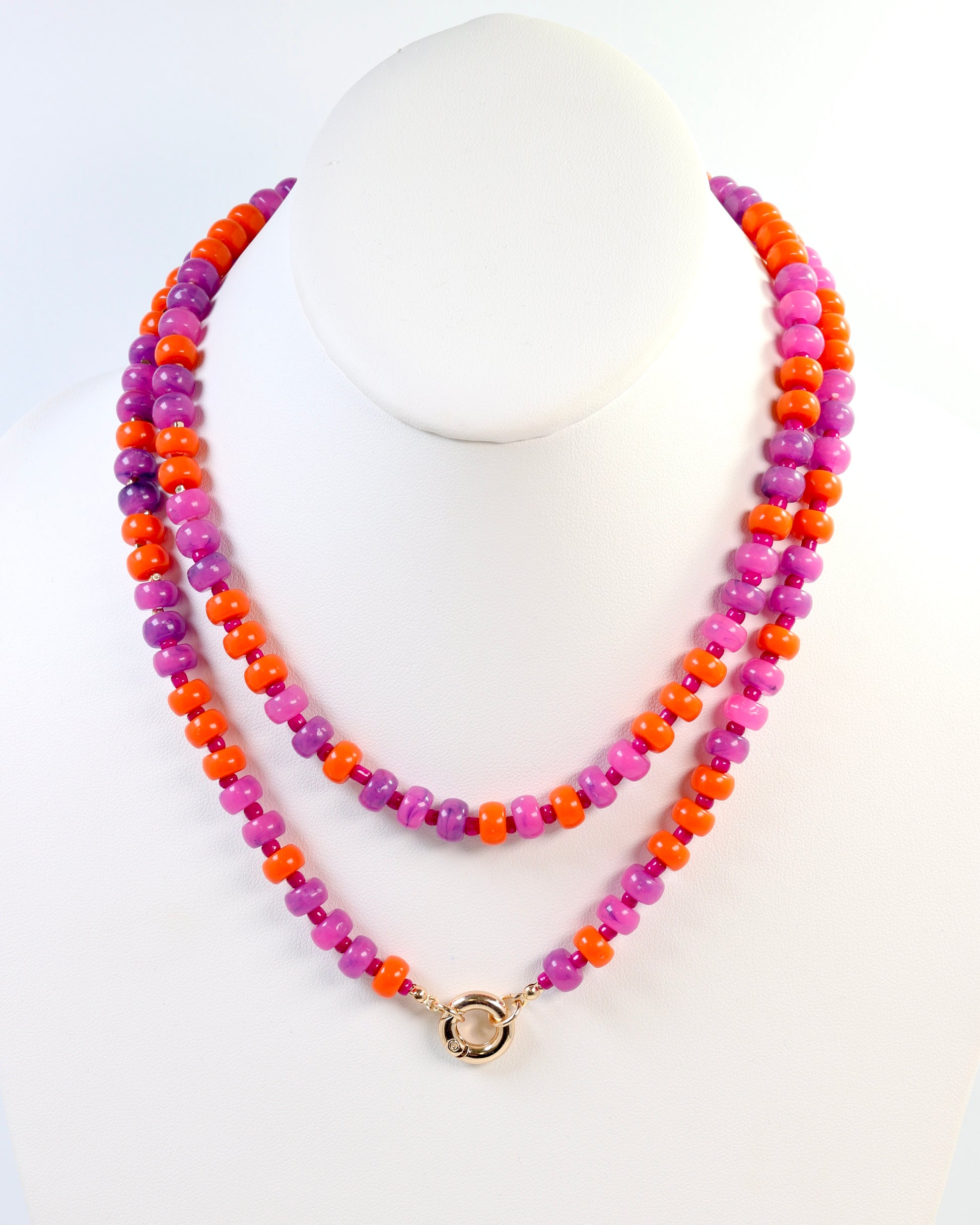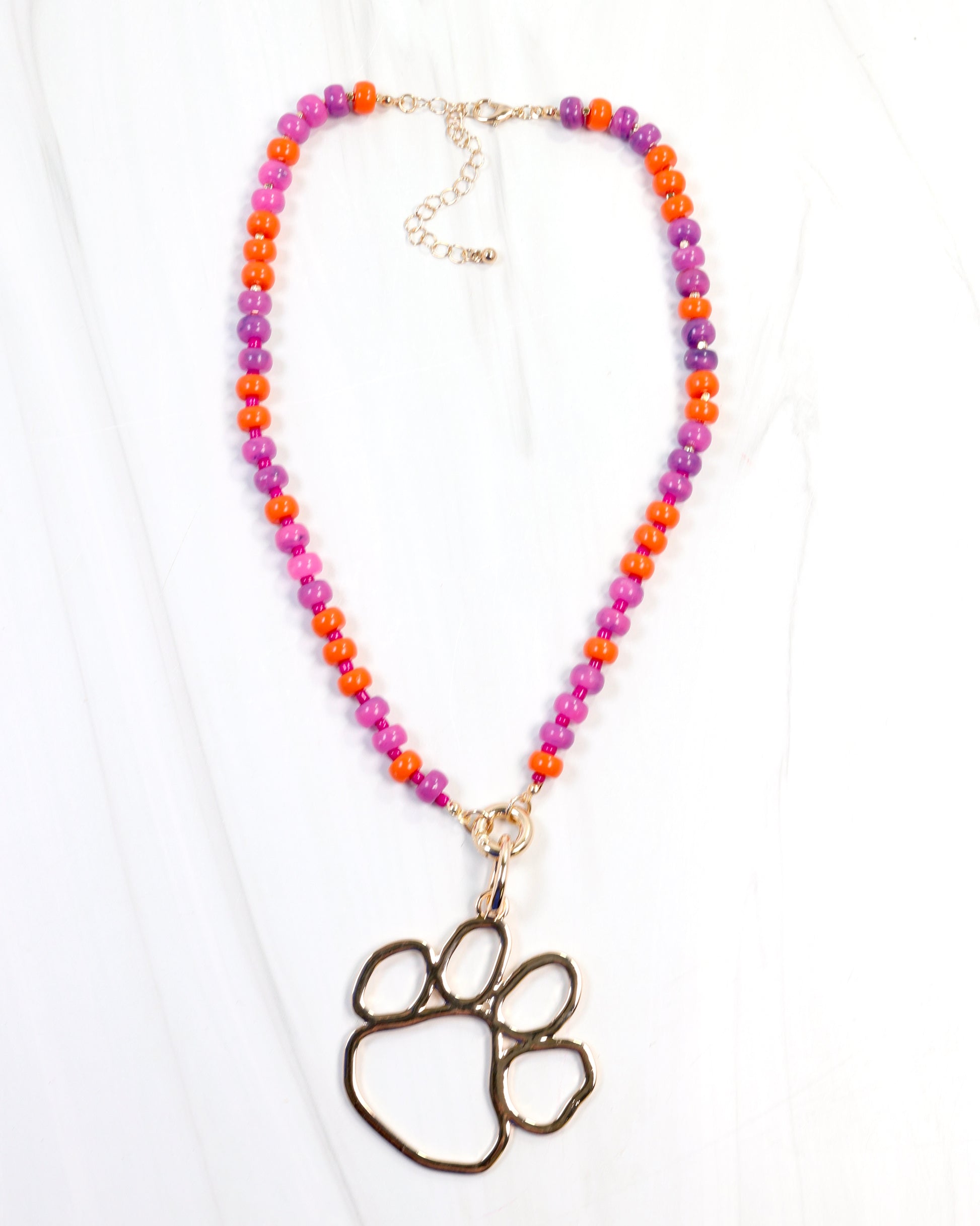Show your team pride in style with the McLane Stone Necklace featuring bold purple and orange stones. This fashionable piece includes a convenient toggle clasp, allowing you to easily add your favorite charm for a personalized touch. Perfect for game day or everyday wear, it combines spirited design with versatile elegance.