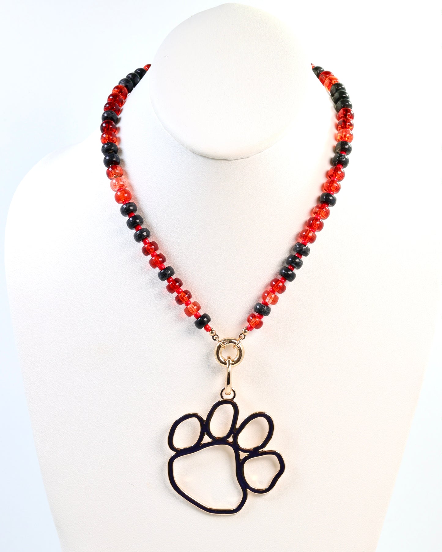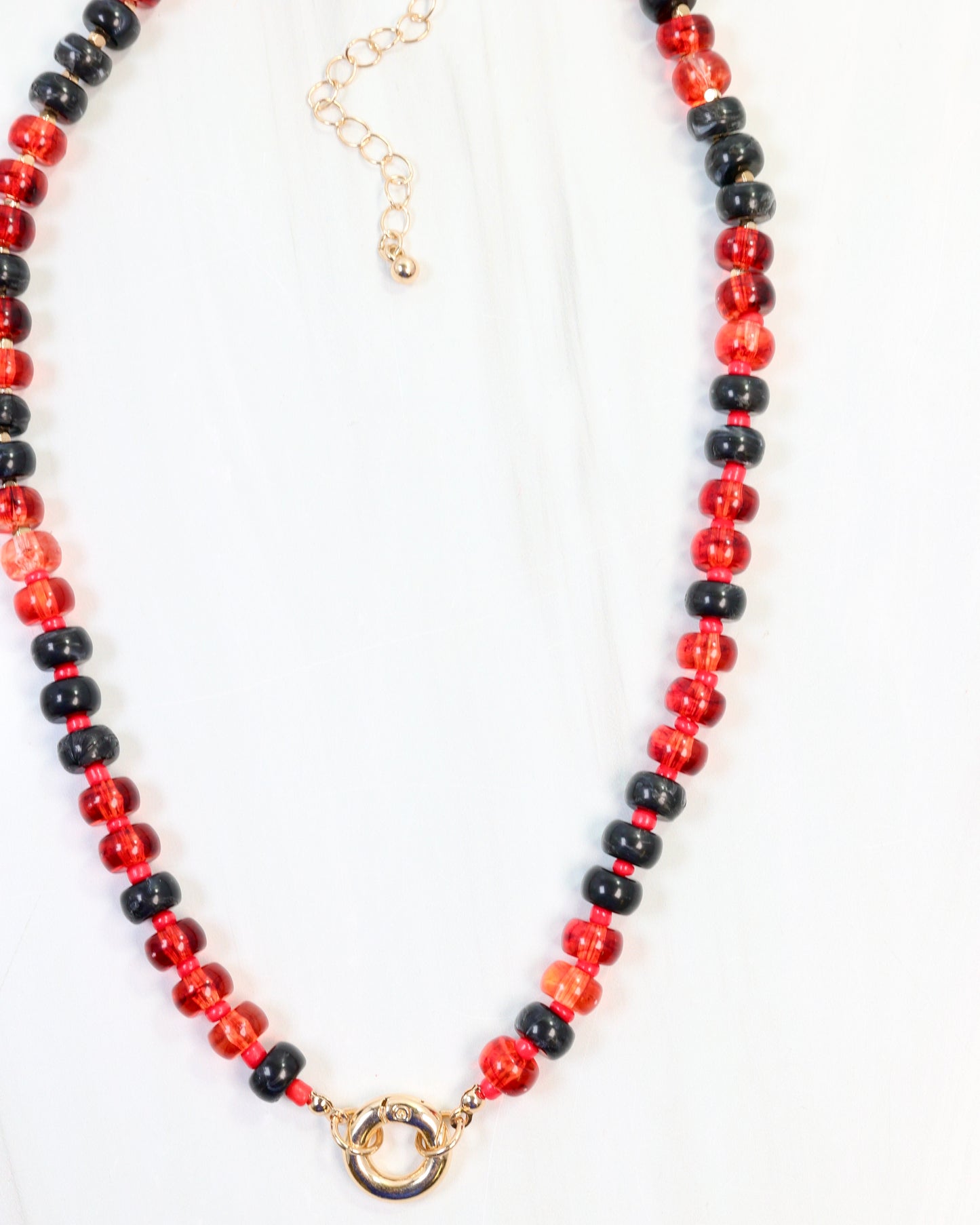 Show your team pride in style with the McLane Stone Necklace featuring bold red and black stones. This fashionable piece includes a convenient toggle clasp, allowing you to easily add your favorite charm for a personalized touch. Perfect for game day or everyday wear, it combines spirited design with versatile elegance.