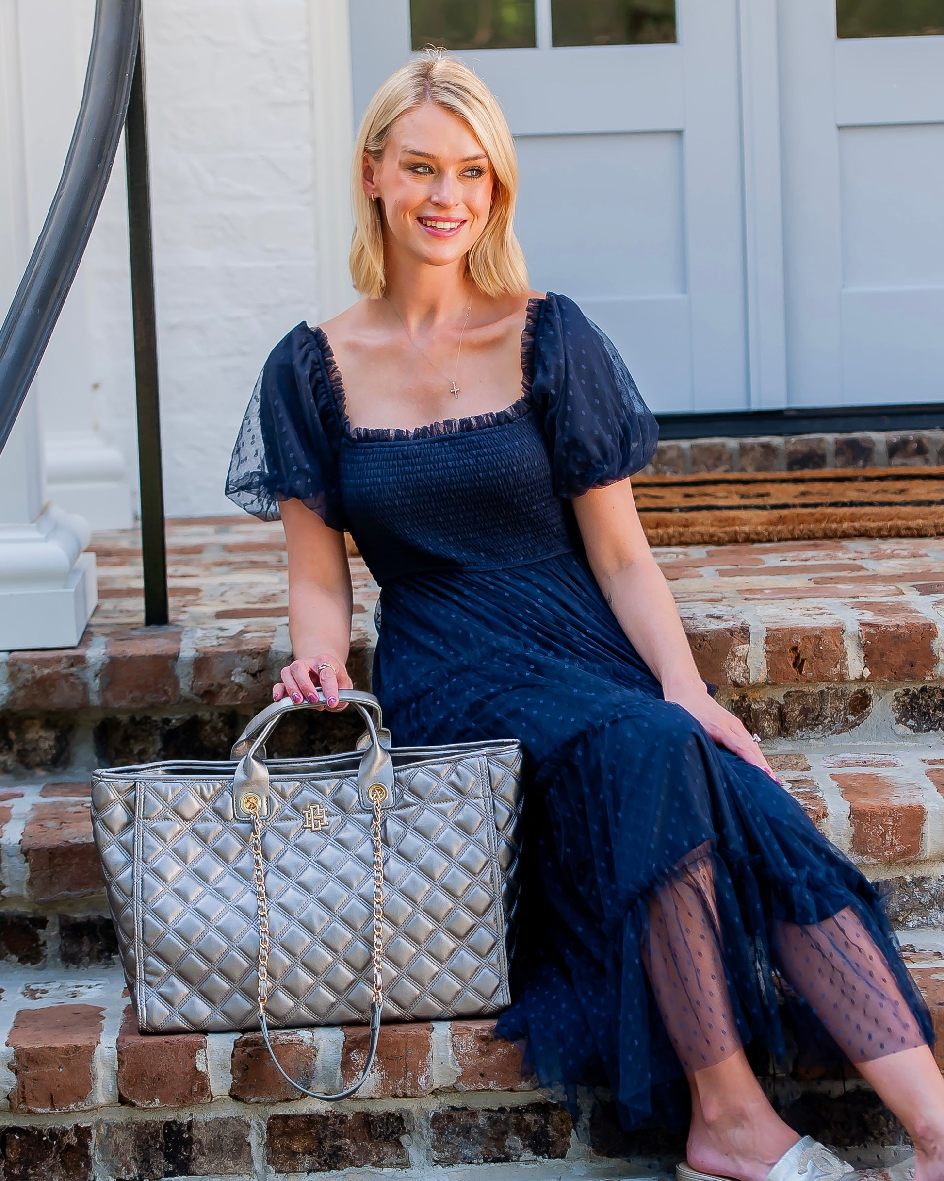 This oversized quilted vegan leather tote is the best go-to handbag! It has two short top handles as well as two elongated braided handles to carry on your shoulder. The Caroline Hill logo is centered at the top of this bag on one side. It has a magnetic closure leading to the roomy interior of the bag. It has one zippered pocket and two open pockets inside. There are also feet on the bottom of the bag for added protection. It's the perfect size for travel, carrying a laptop, or for everyday fashion.