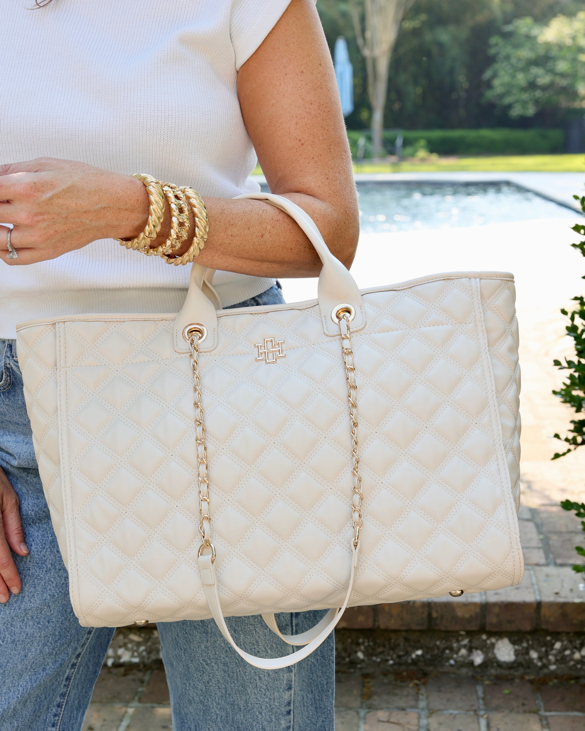 This oversized vegan leather tote is the best go-to handbag! It has two short top handles as well as two elongated braided handles to carry on your shoulder. The Caroline Hill logo is centered at the top of this bag on one side. It has a magnetic closure leading to the roomy interior of the bag. It has one zippered pocket and two open pockets inside. There are also feet on the bottom of the bag for added protection. It's the perfect size for travel, carrying a laptop, or for everyday fashion.