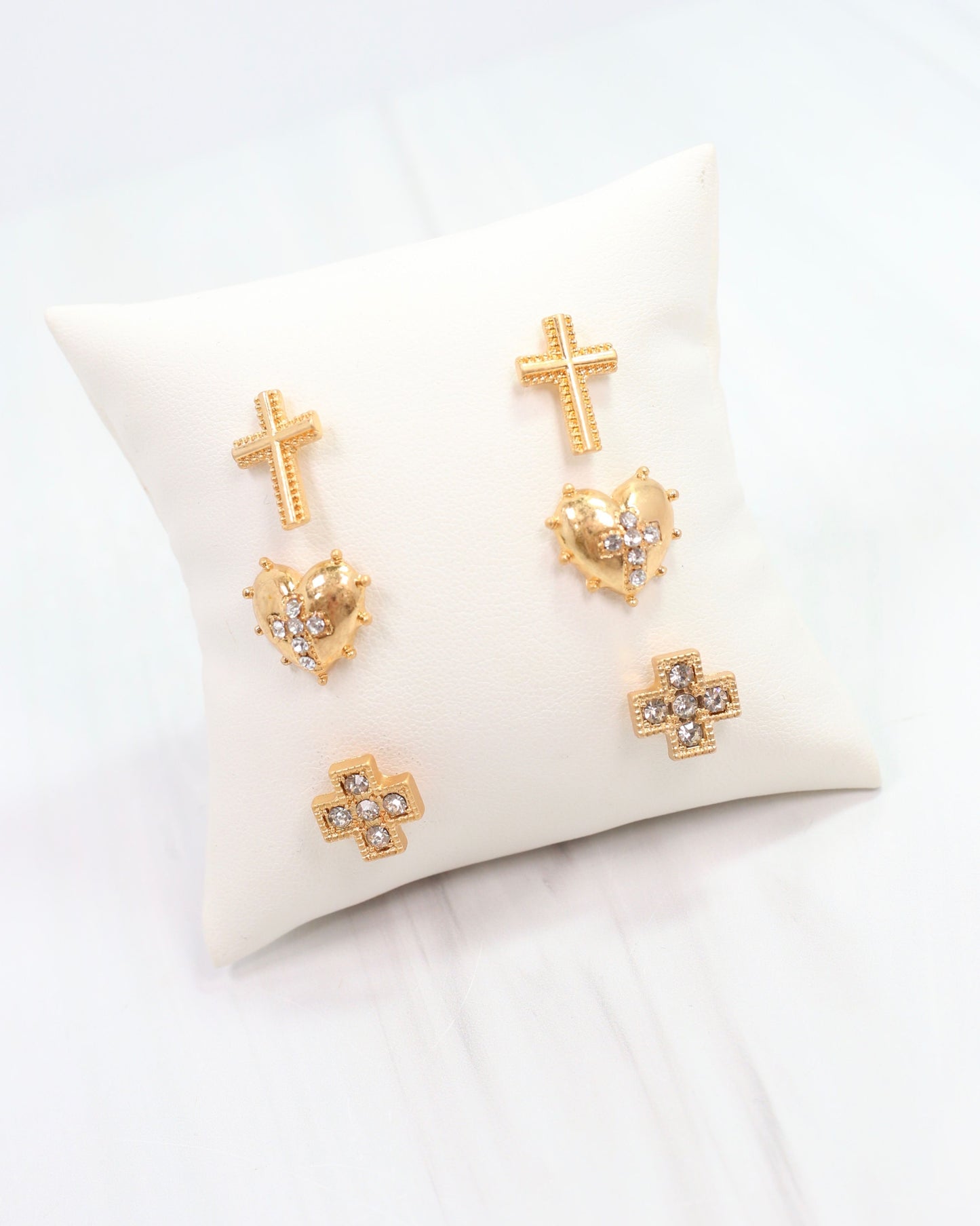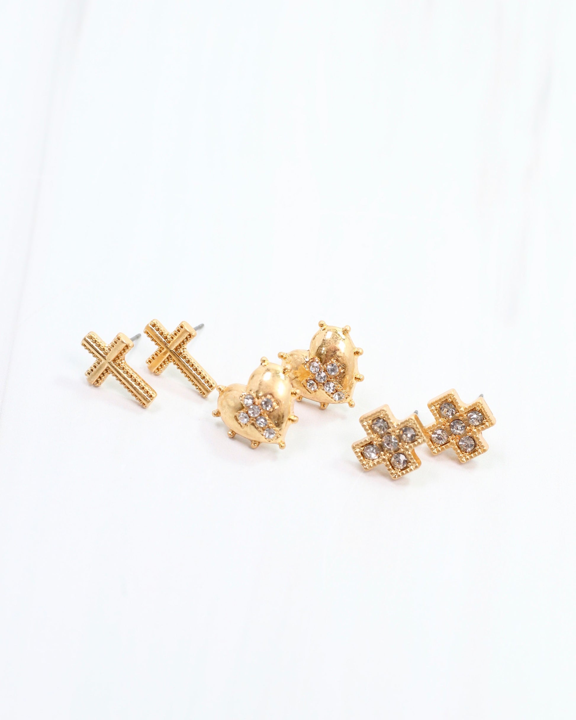 Get ready to rock your unique style with the Minton Cross Earring Set in worn gold! This set includes three pairs of earrings - a long cross, a heart with dot detailing, and a gold block cross stud with clear stones. Made with titanium posts for durability and endless fashion possibilities!