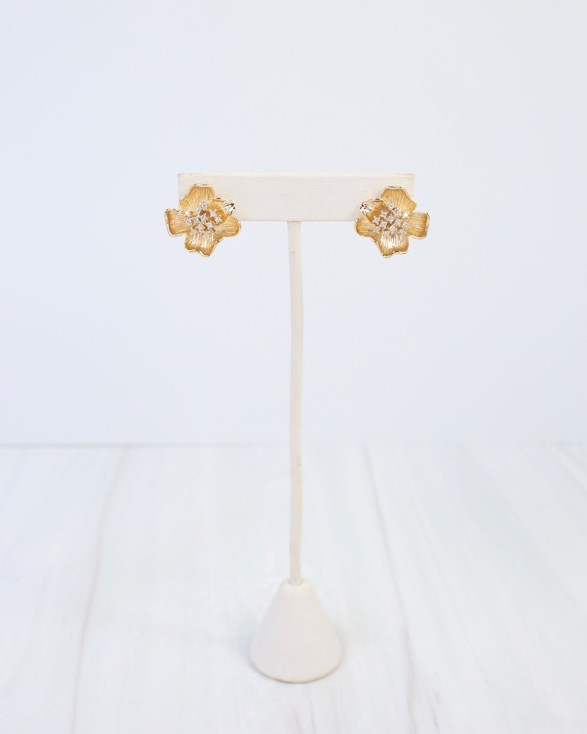 Bloom with confidence in the Mount Holly CZ Flower Earrings in gold. These charming studs showcase a delicate floral design adorned with brilliant cubic zirconia that sparkles with every turn of your head. The romantic flower silhouette pairs perfectly with both casual and dressed-up looks, while the luxe gold finish adds instant sophistication. A joyful, feminine touch that brings natural beauty to your everyday style.