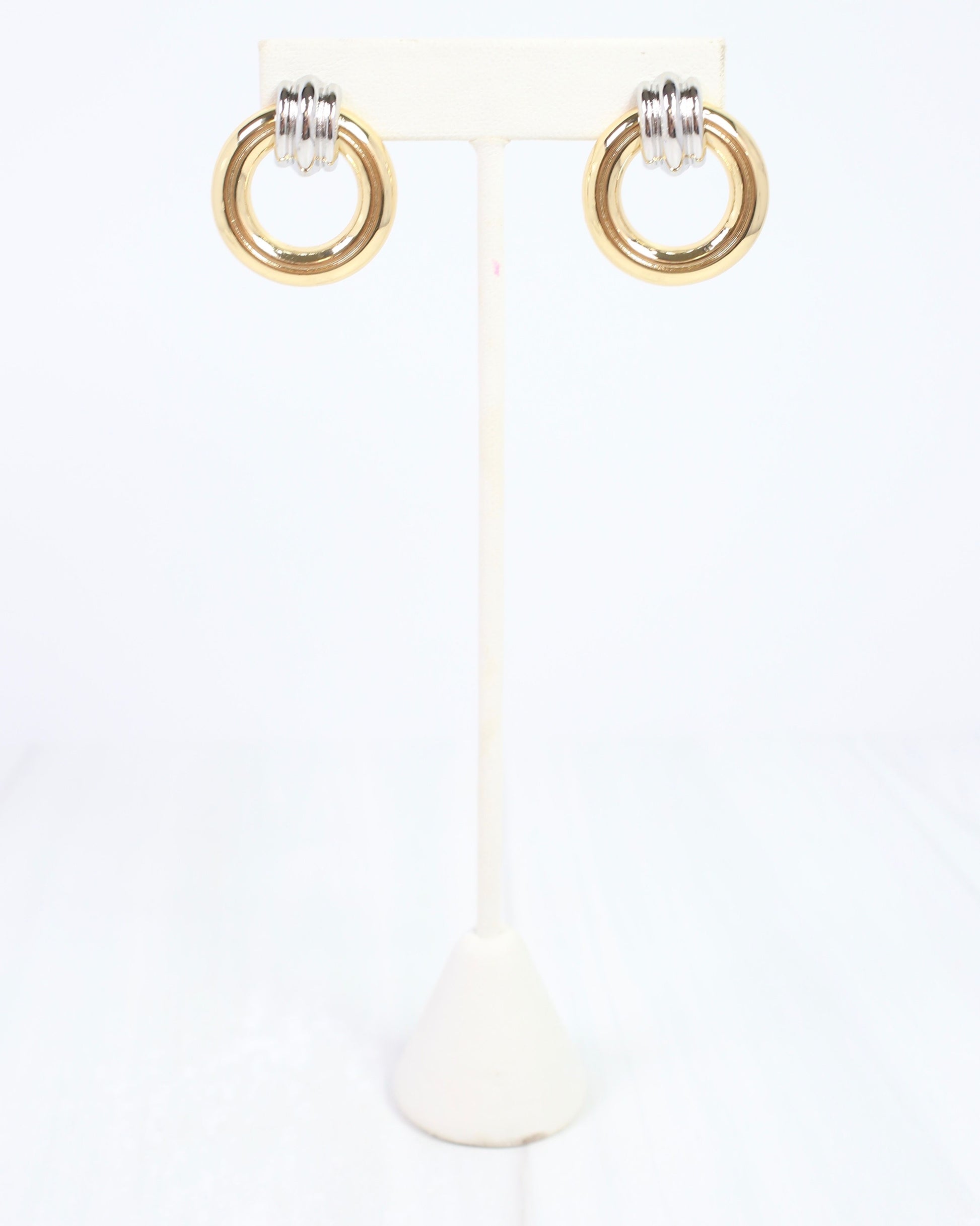 Elevate your look with the Munford Circle Drop Earring in Gold and Silver. Featuring a shiny circular design paired with a triple row stud, this door knocker style earring adds a bold, stylish statement to any outfit. Perfect for adding a touch of modern elegance to your accessory collection.