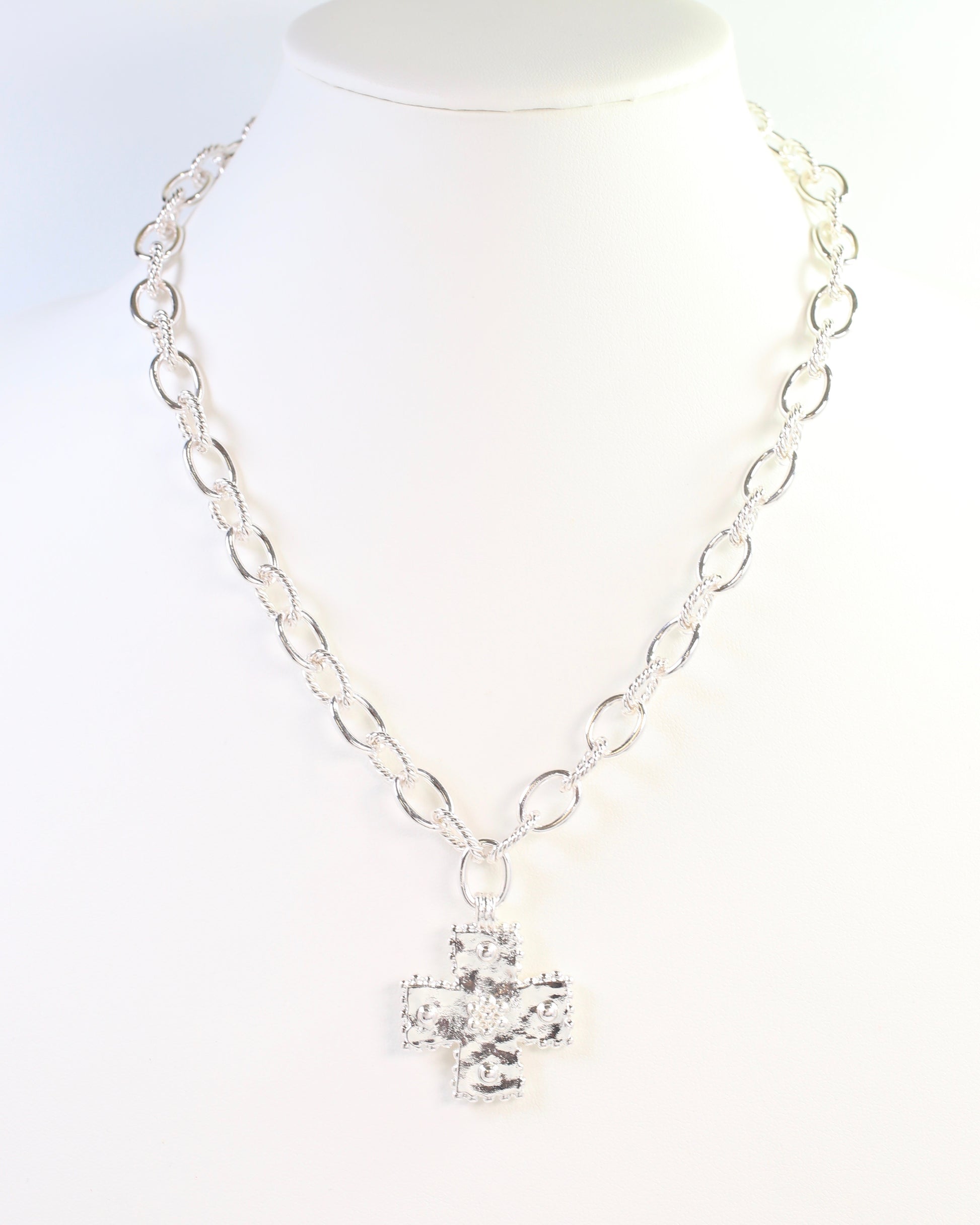 Embrace vintage vibes with the Murray Cross Charm Necklace in silver! This playful piece features alternating smooth and twisted textured links that catch the light with every move. The standout vintage cross pendant, adorned with charming dotted details around the edge, adds just the right touch of nostalgic flair to your everyday look!