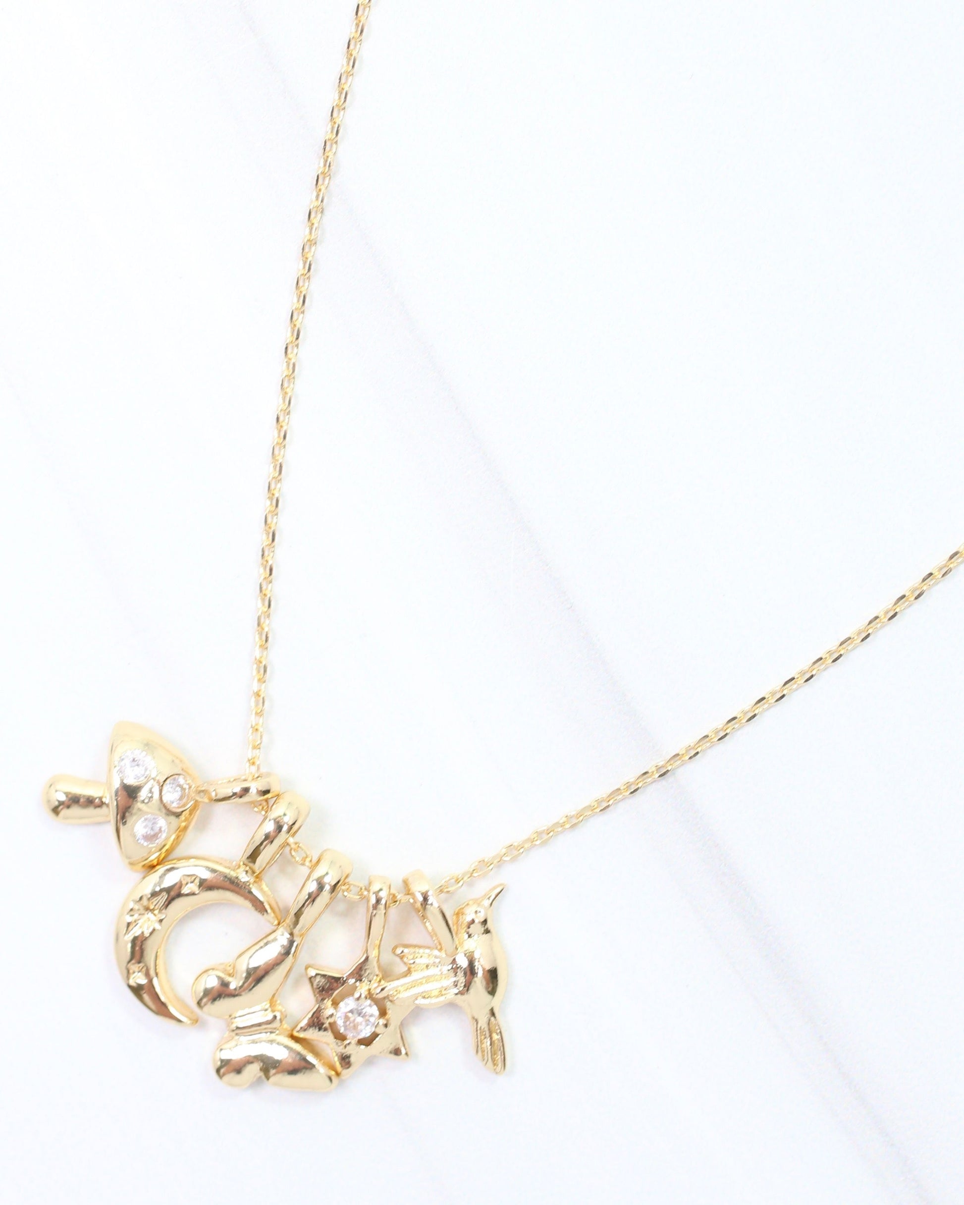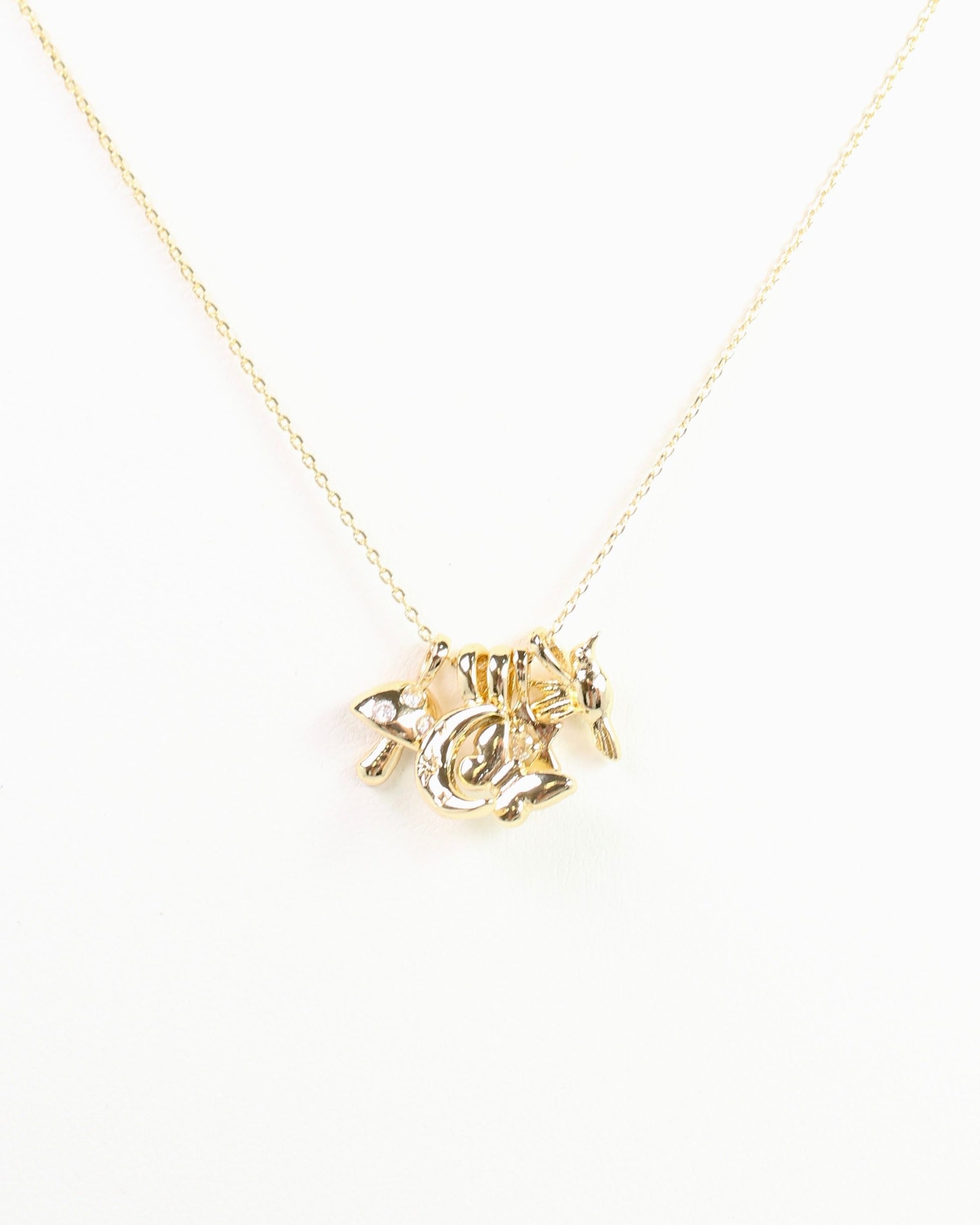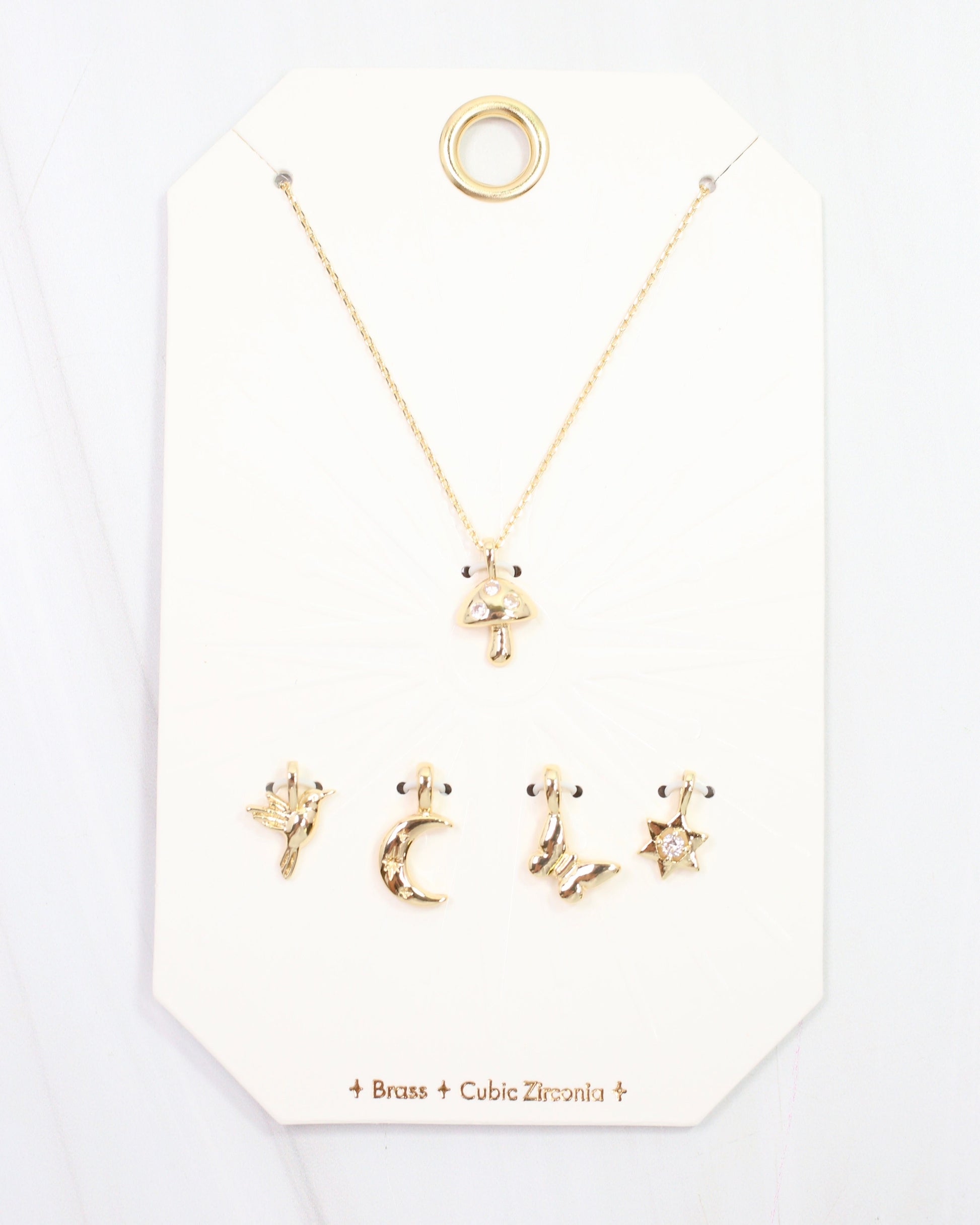 Add a touch of whimsy to your look with the Mushroom Magic Charm Necklace Set in Gold. This playful set features five charming brass charms—a mushroom, hummingbird, butterfly, and a star with a sparkling CZ center—delicately arranged on a fine chain. Perfect for those who love a little magic and nature-inspired sparkle in their everyday style.