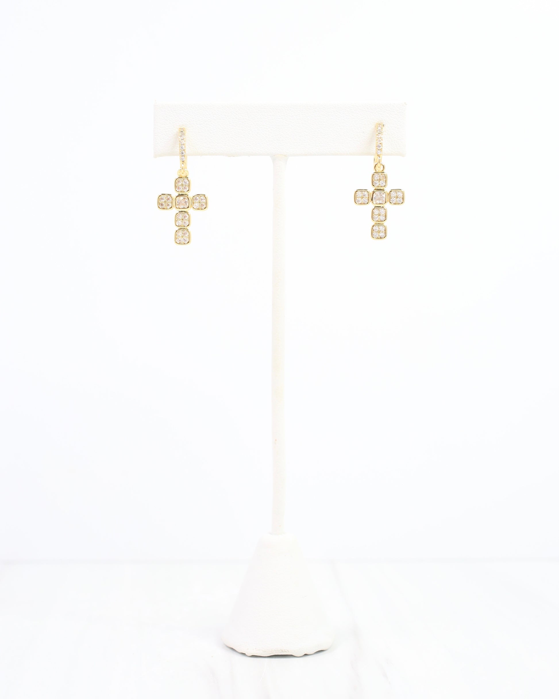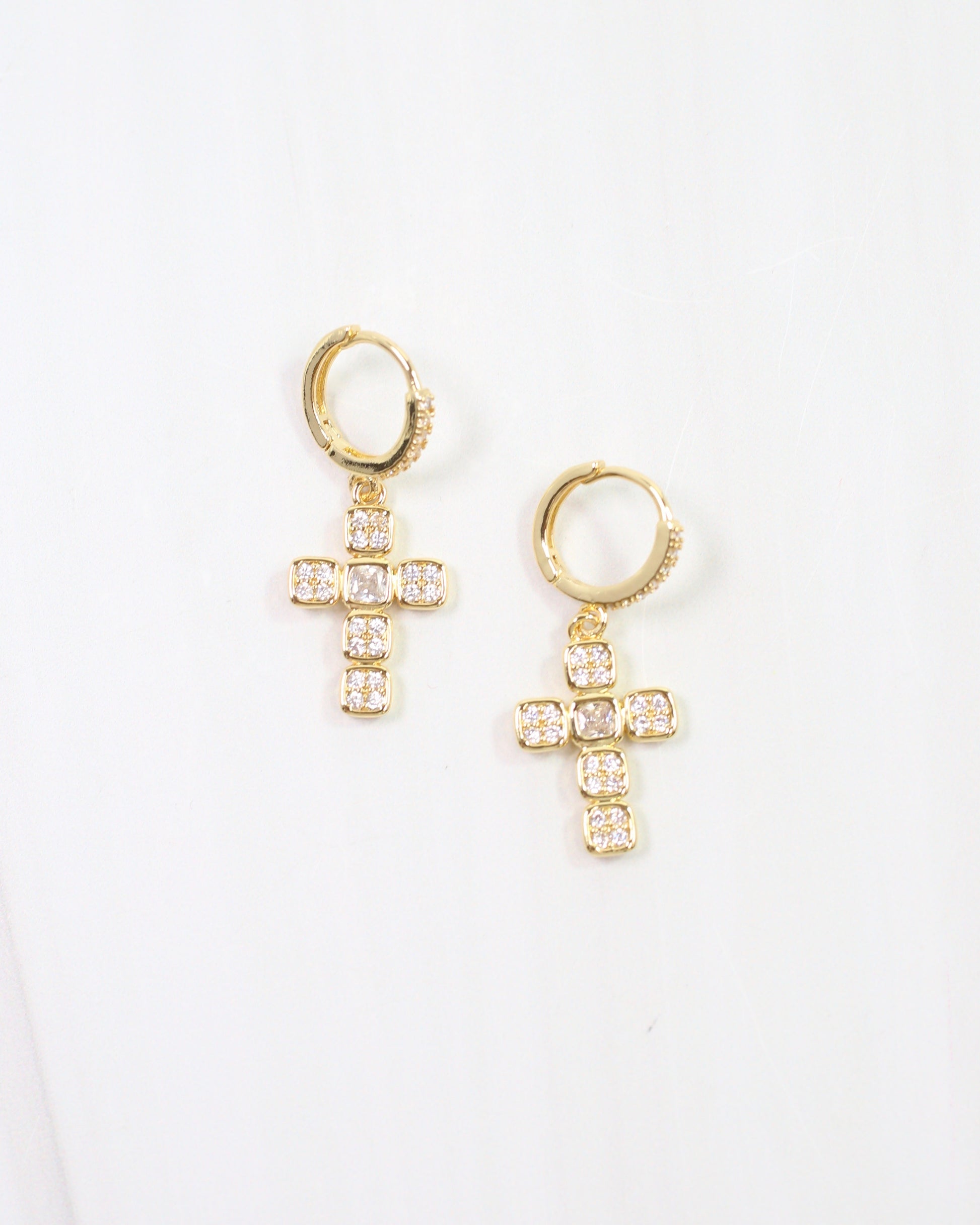 The Nadia Cross Earring in Gold is a fun gold huggie with a sparkling dangling cross featuring square CZ accents—perfect for adding a bit of edge to any look.