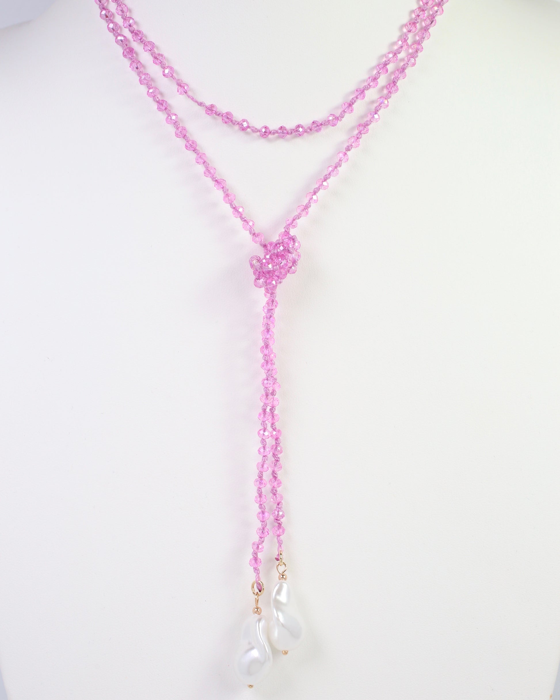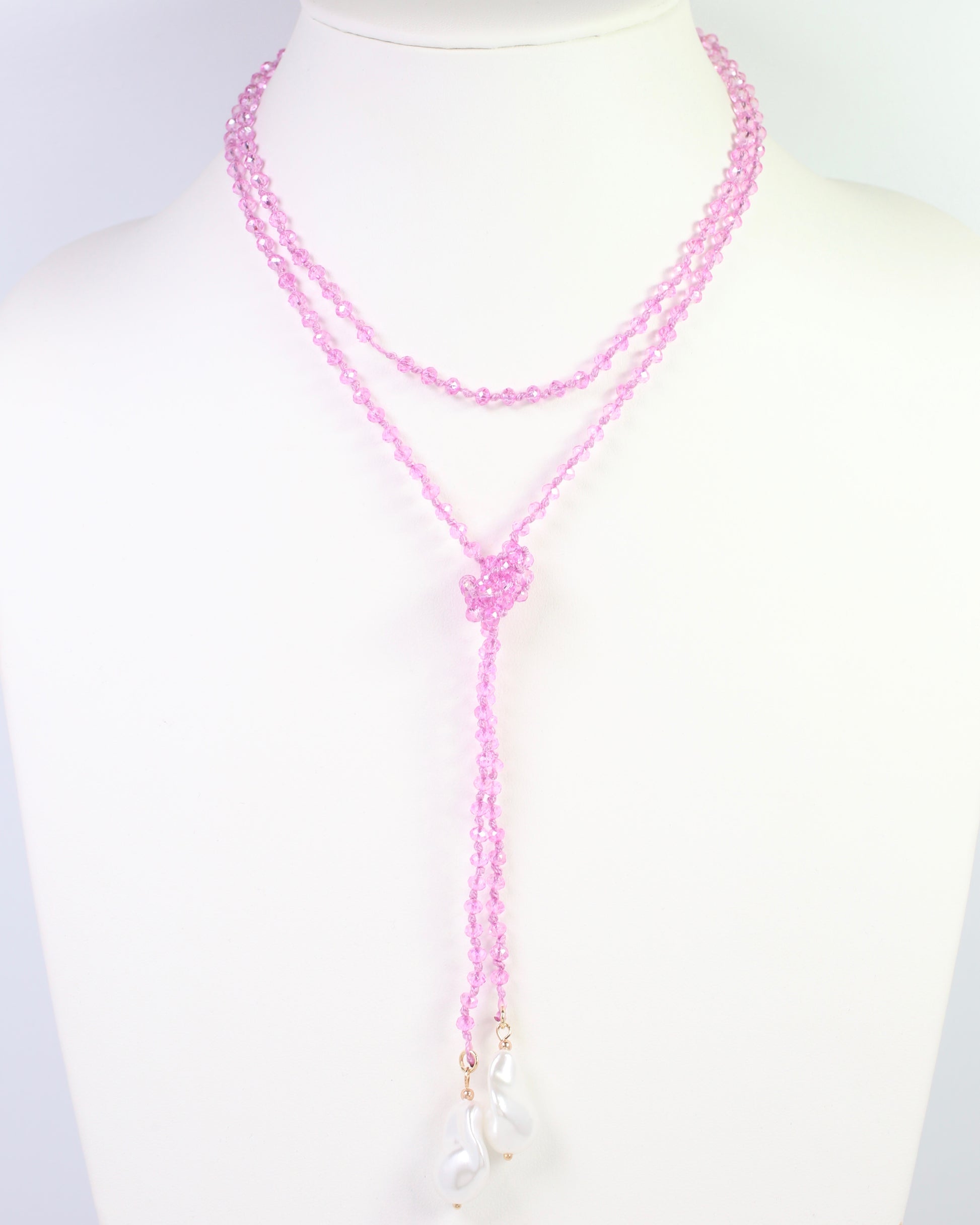 Energize your jewelry collection with this stunning long beaded necklace, featuring delicate knotted pink beads that create an ethereal, layered aesthetic. The piece is finished with luxurious baroque pearl ends that add sophistication and organic texture. Perfect for layering or wearing solo, this necklace transitions seamlessly from casual daytime elegance to evening glamour. The extended length offers versatile styling options, draping beautifully against any neckline. An investment piece that combines contemporary design with timeless pearl appeal.