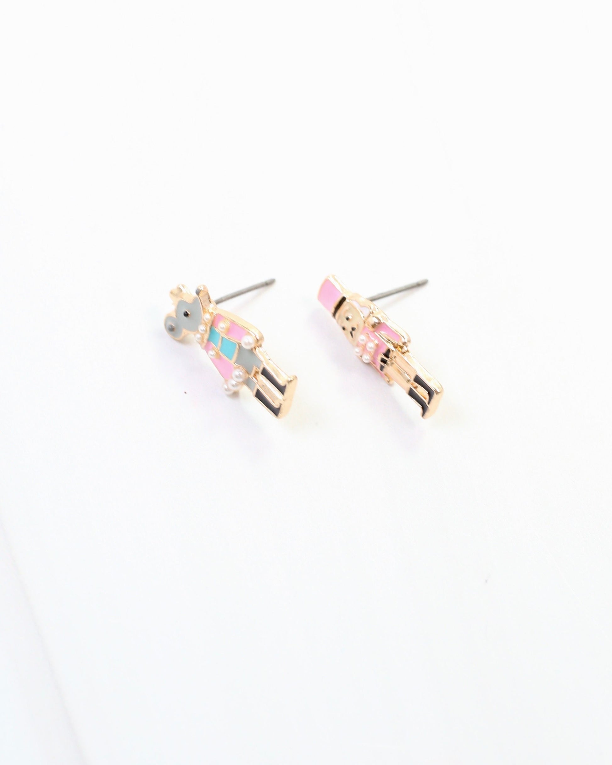 Add a festive touch to your look with the Nutcracker Suite Dreams Earring in Pink. Featuring charming small enamel studs of the nutcracker and mouse king, each earring is delicately accented with petite pearls for a subtle, elegant shimmer. Perfect for holiday ensembles or year-round whimsy, these earrings offer a fashionable nod to a classic tale.